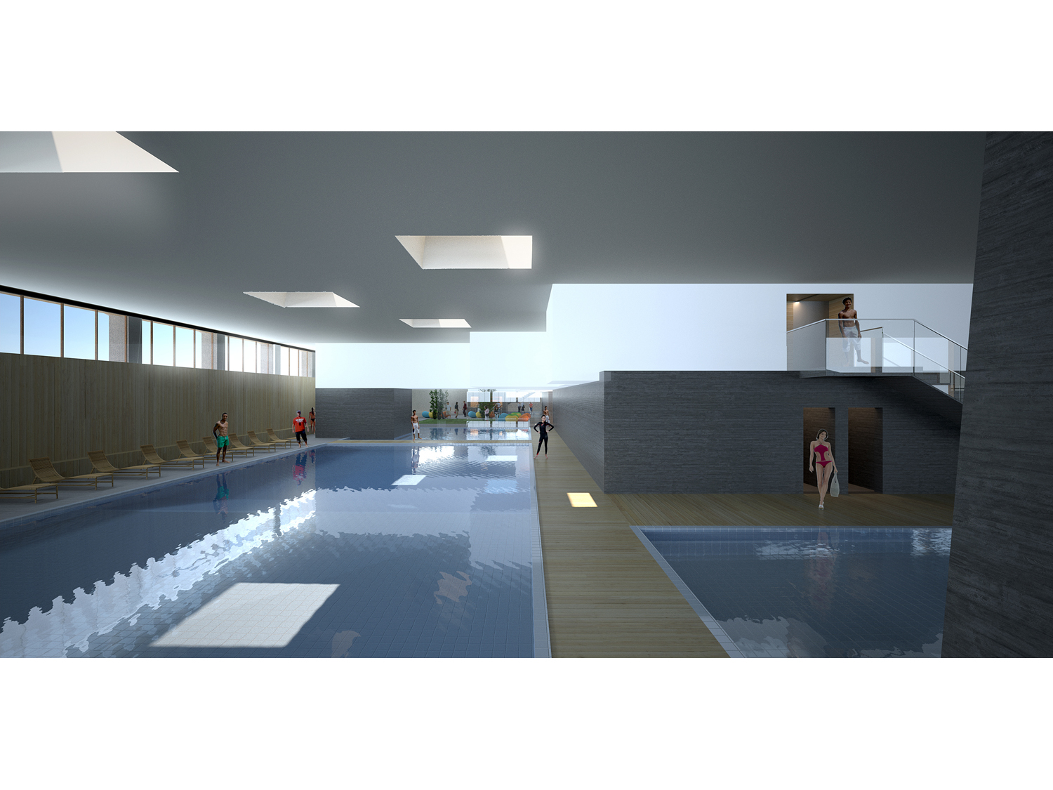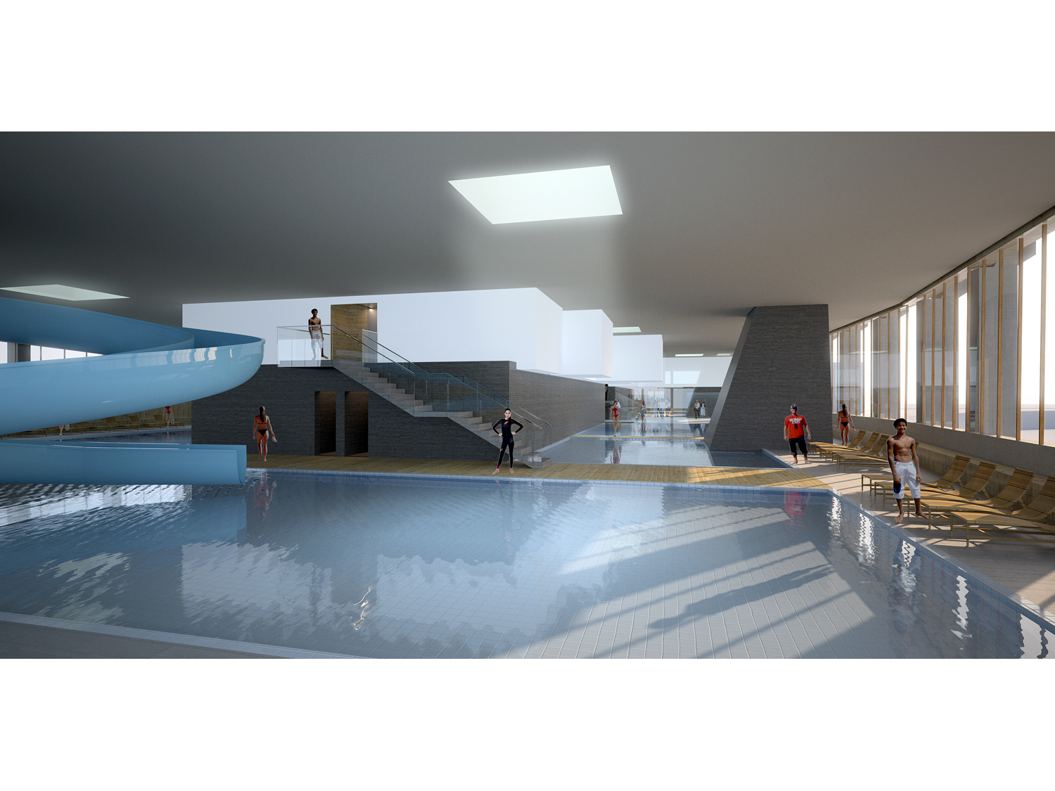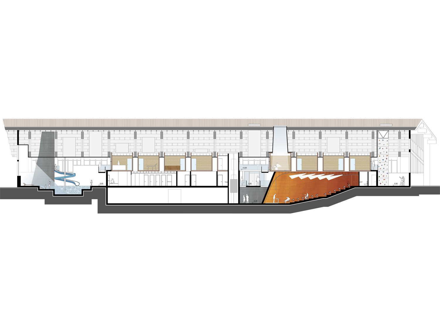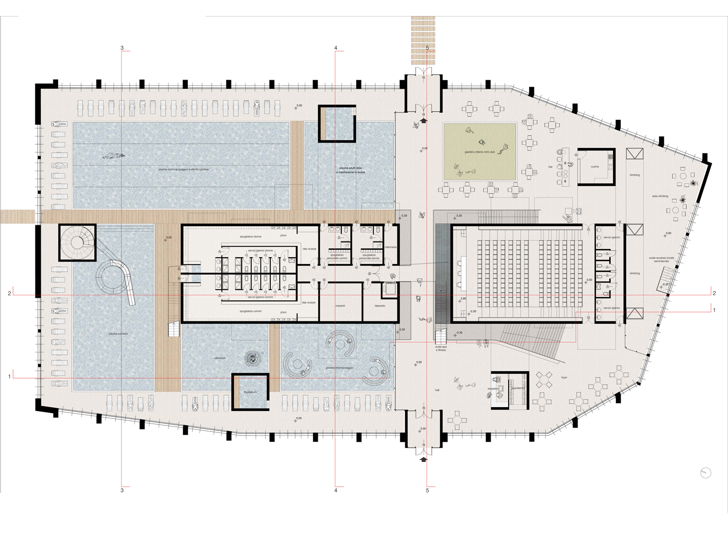Si è scelto di creare un centro fitness wellness con ampie piscine, di inserire un auditorium ed inoltre conservare la palestra di roccia al coperto esistente, come richiesto.