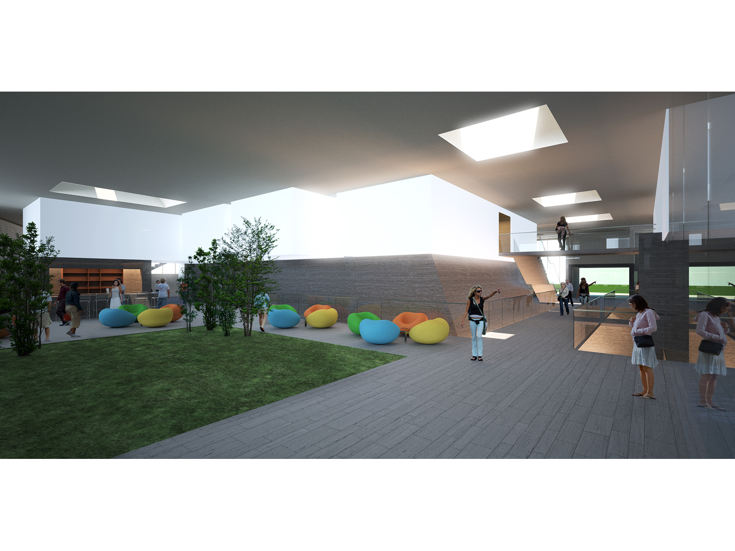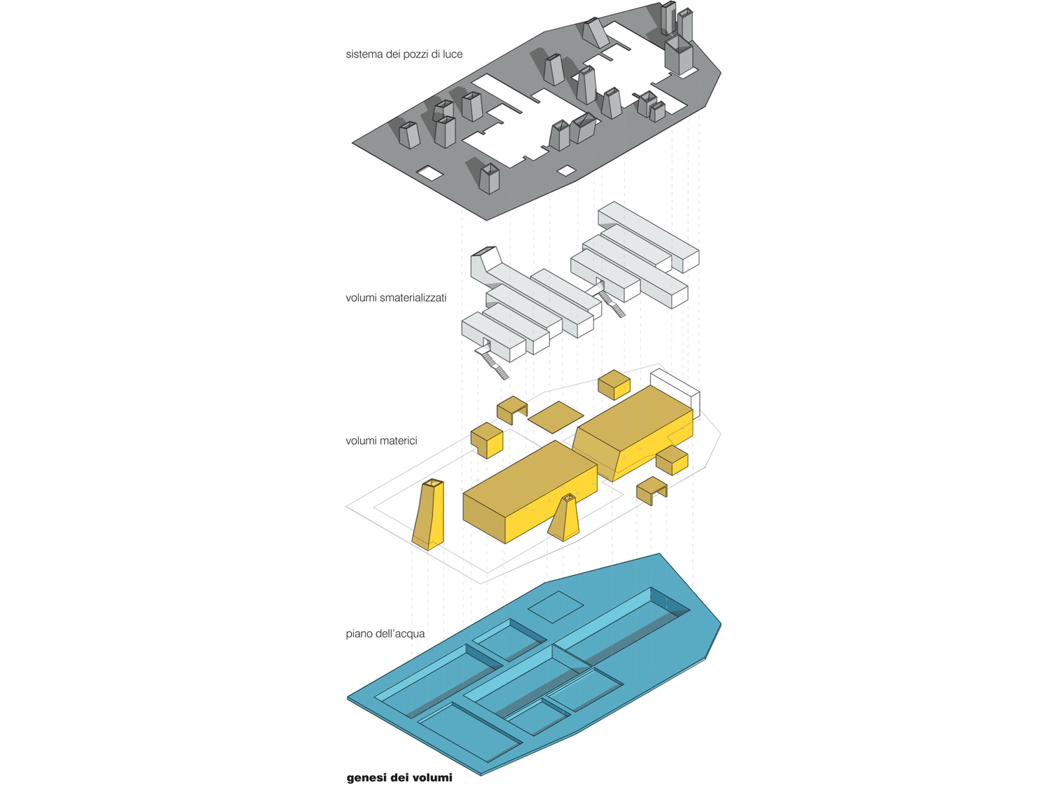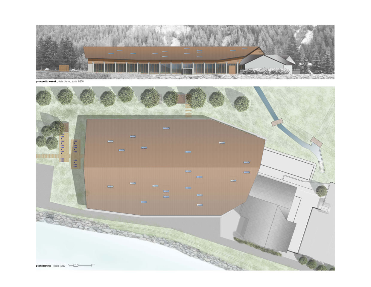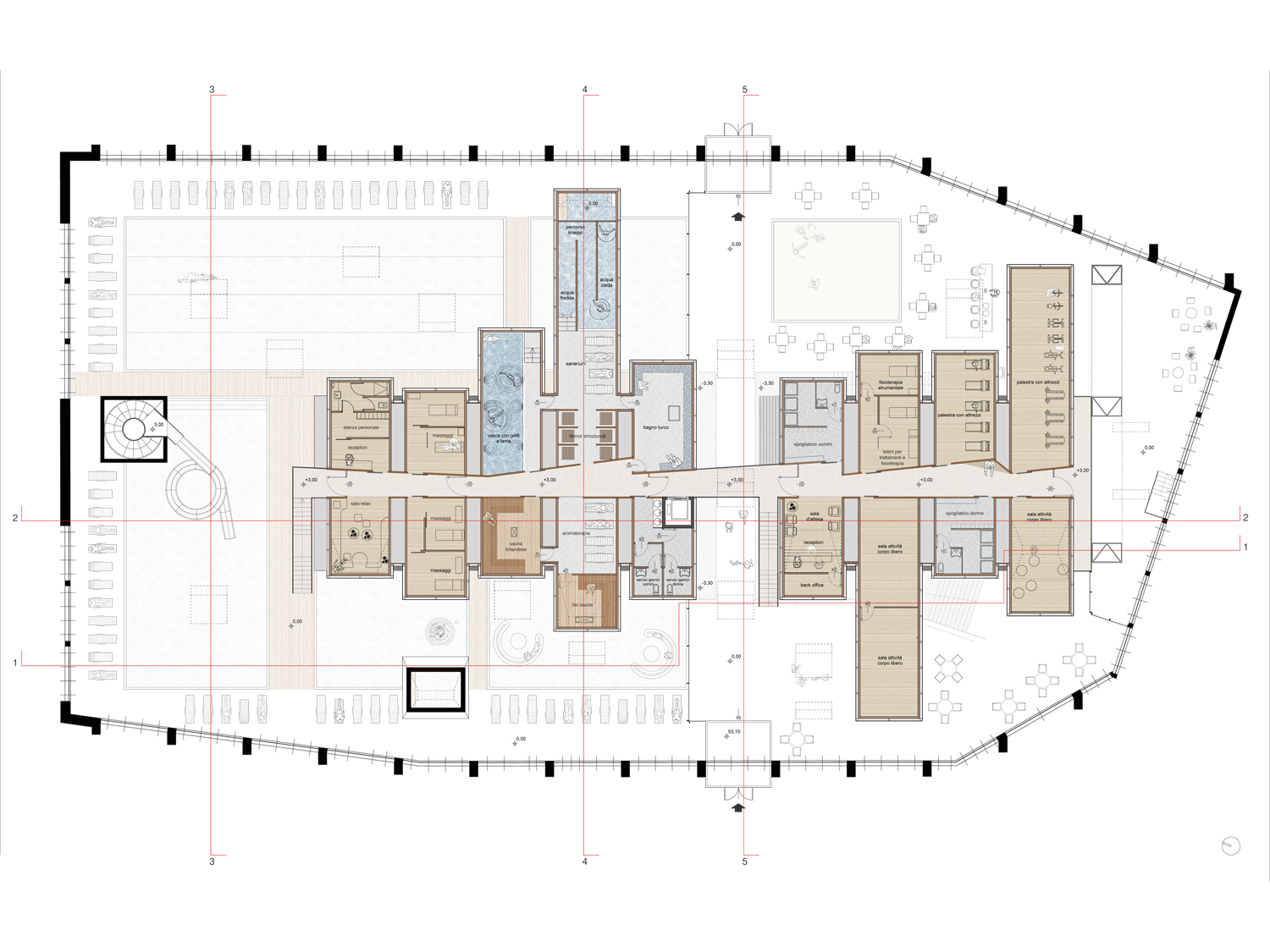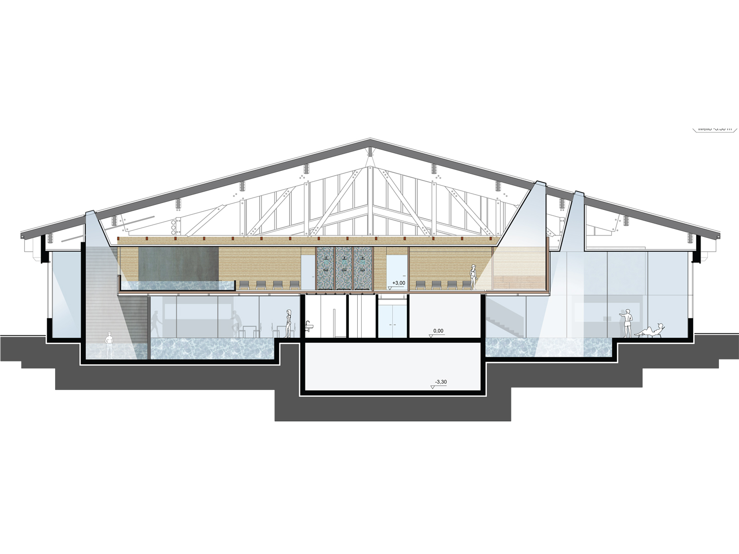 Si è scelto di creare un centro fitness wellness con ampie piscine, di inserire un auditorium ed inoltre conservare la palestra di roccia al coperto esistente, come richiesto.