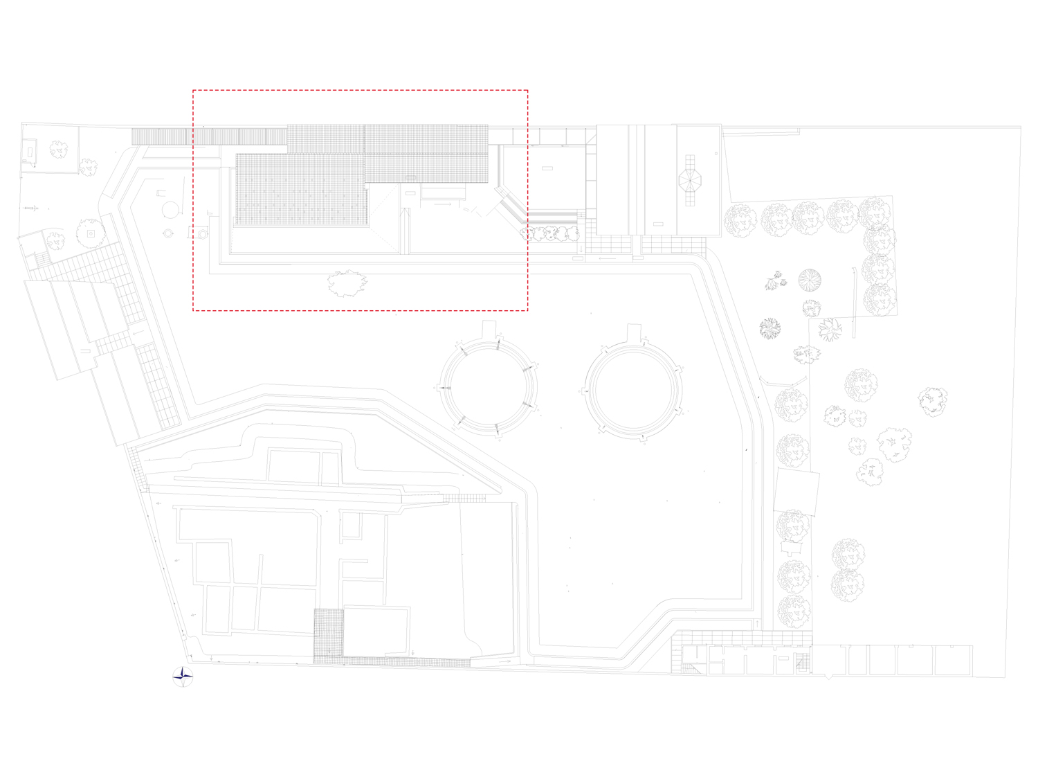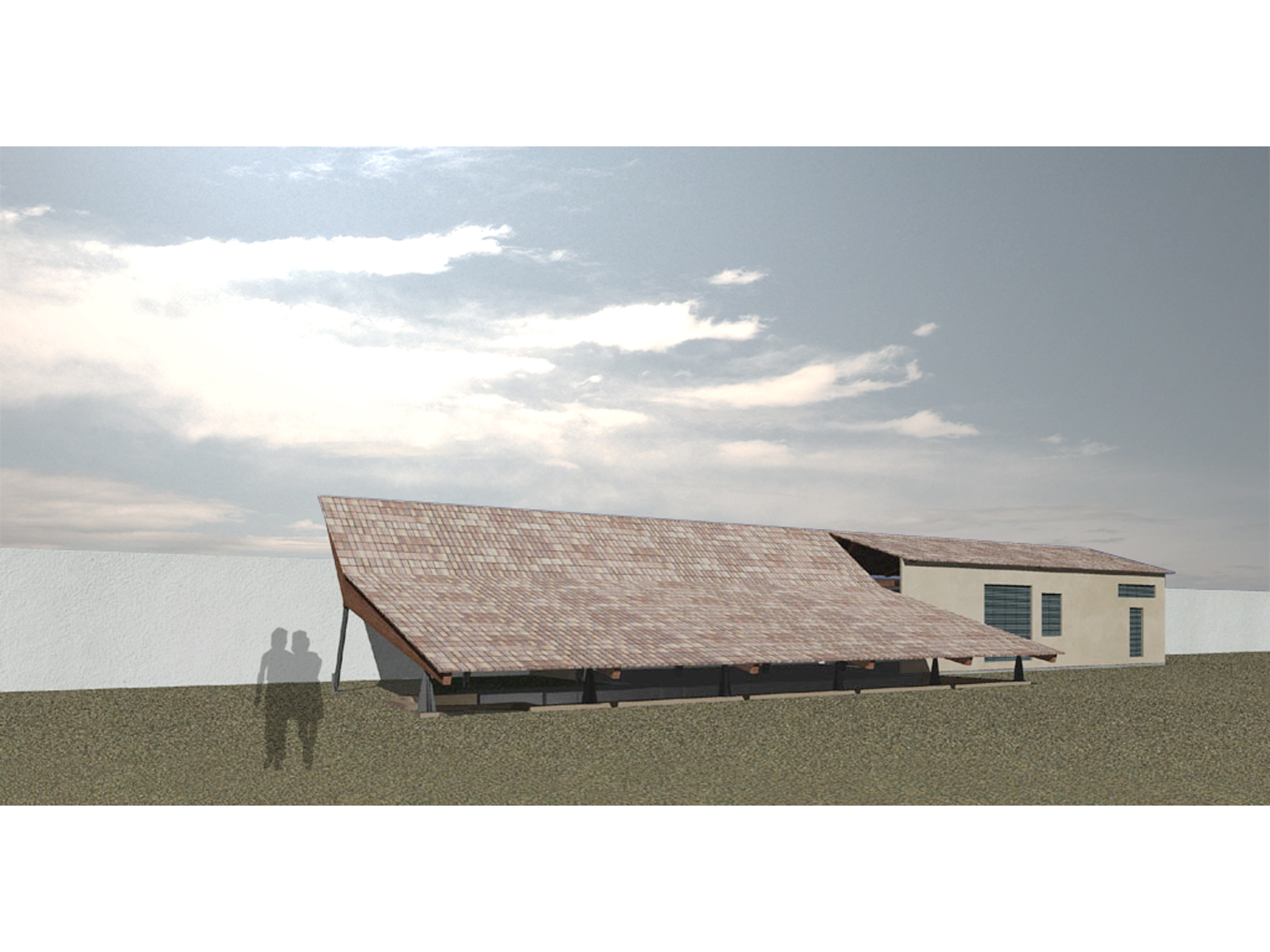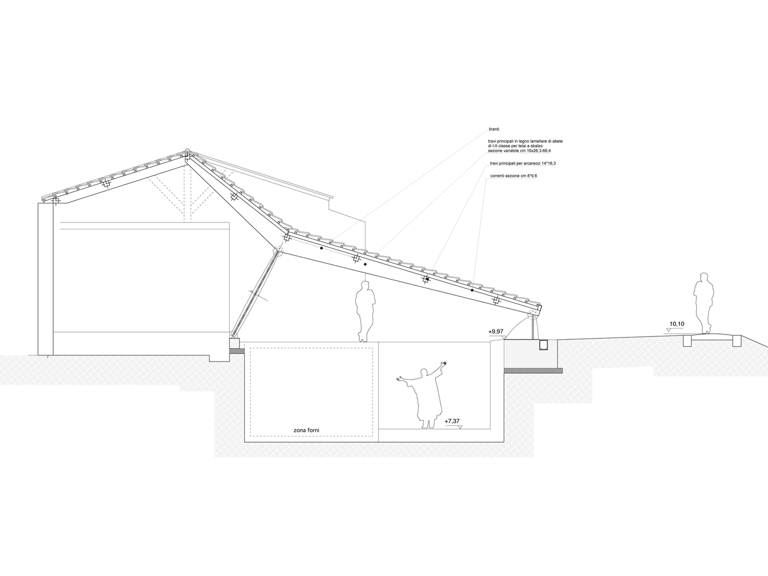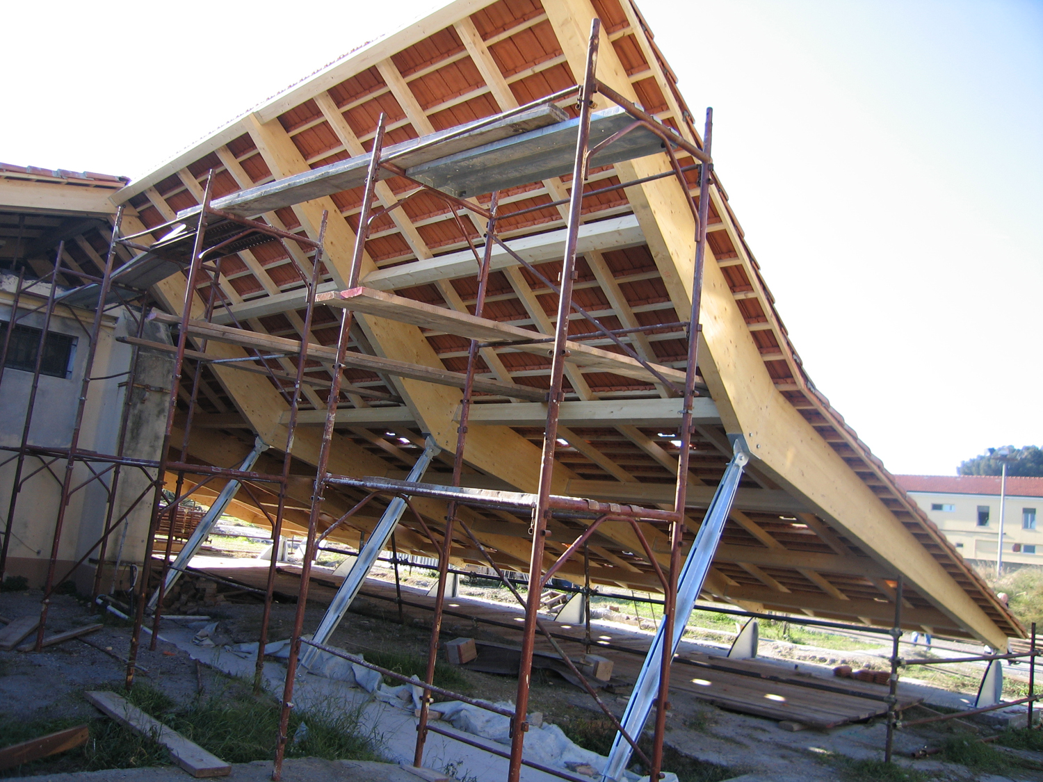 Il progetto per la copertura degli scavi sceglie proprio di giocare sulla inclinazione delle falde e sulla copertura in tegole. Una serie di travi in legno lamellare origina dalla linea di colmo dell’edificio, ne esagera l’inclinazione, continua dove ci si aspetterebbe finalmente il muro e invece di toccare terra lascia passare una lama di luce che illumina gli scavi.