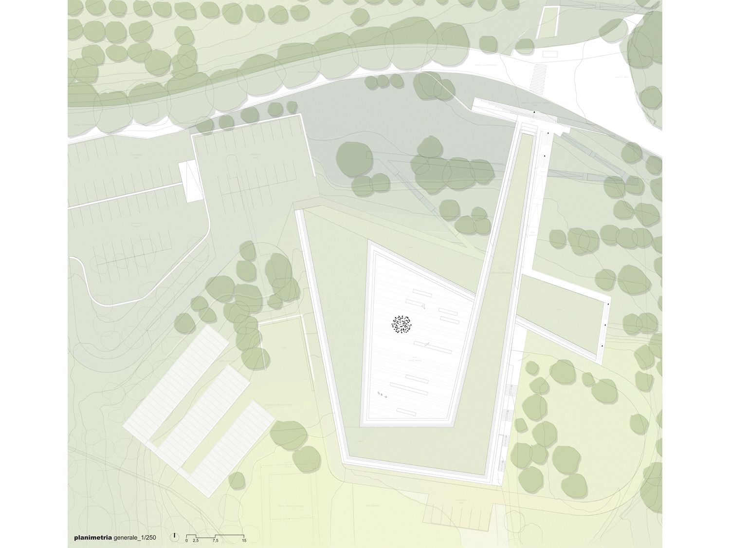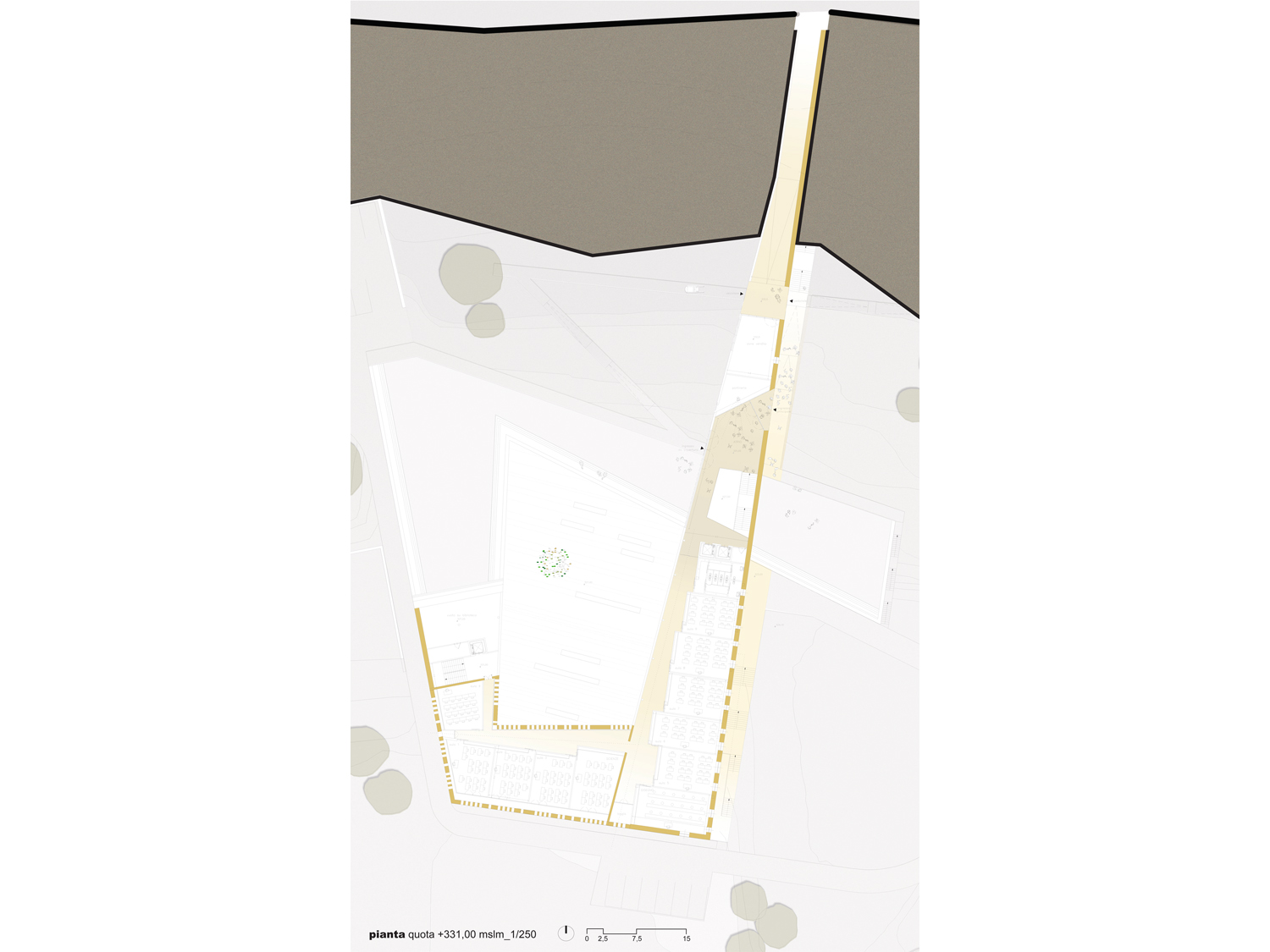 Il perimetro esterno del parcheggio è lasciato molto aperto, leggero, bordato solo dai guard-rail. In profondità si scorgono le facciate della corte e il volume acquista profondità e alleggerisce la propria presenza visiva nei confronti degli edifici circostanti.