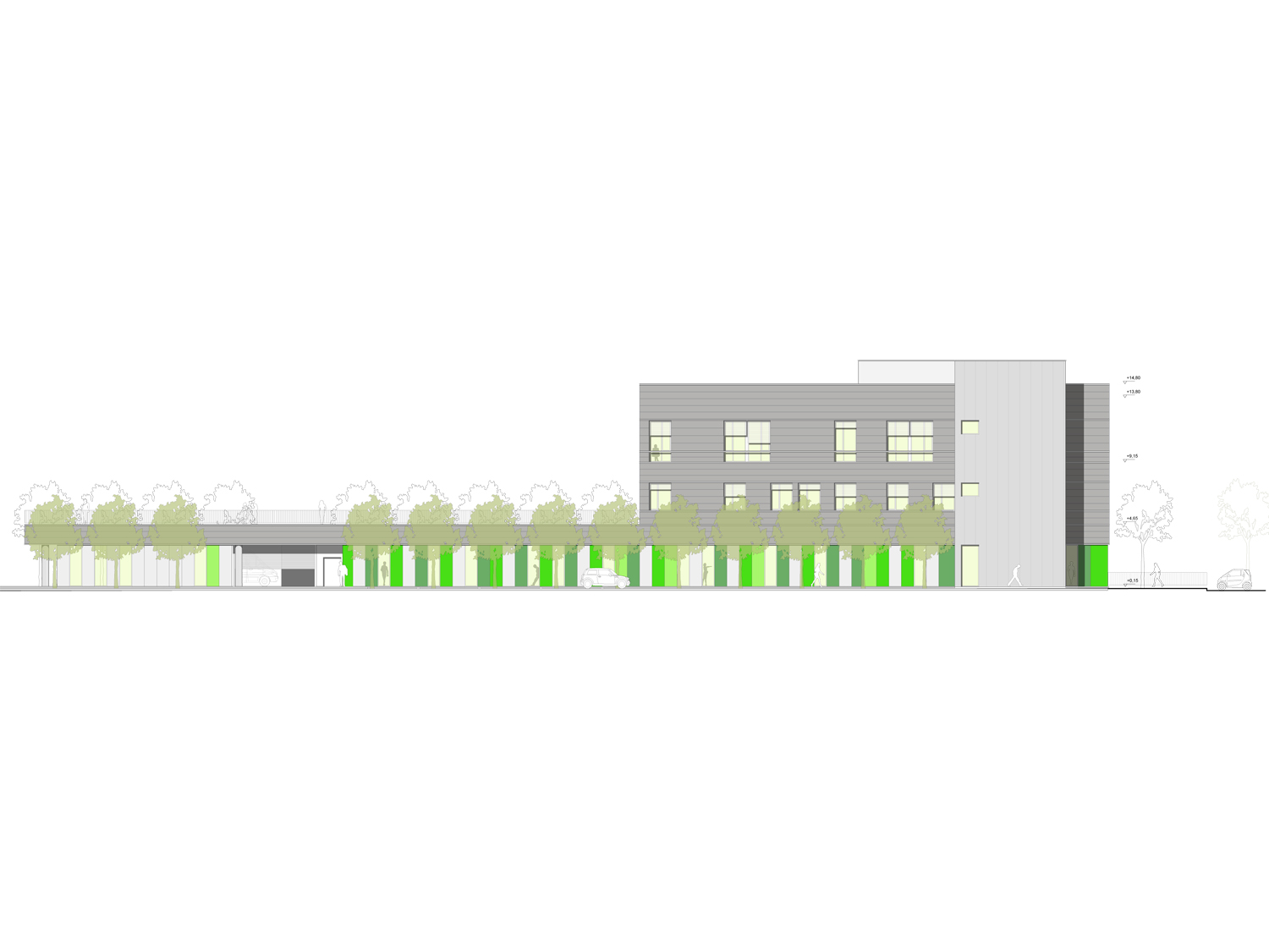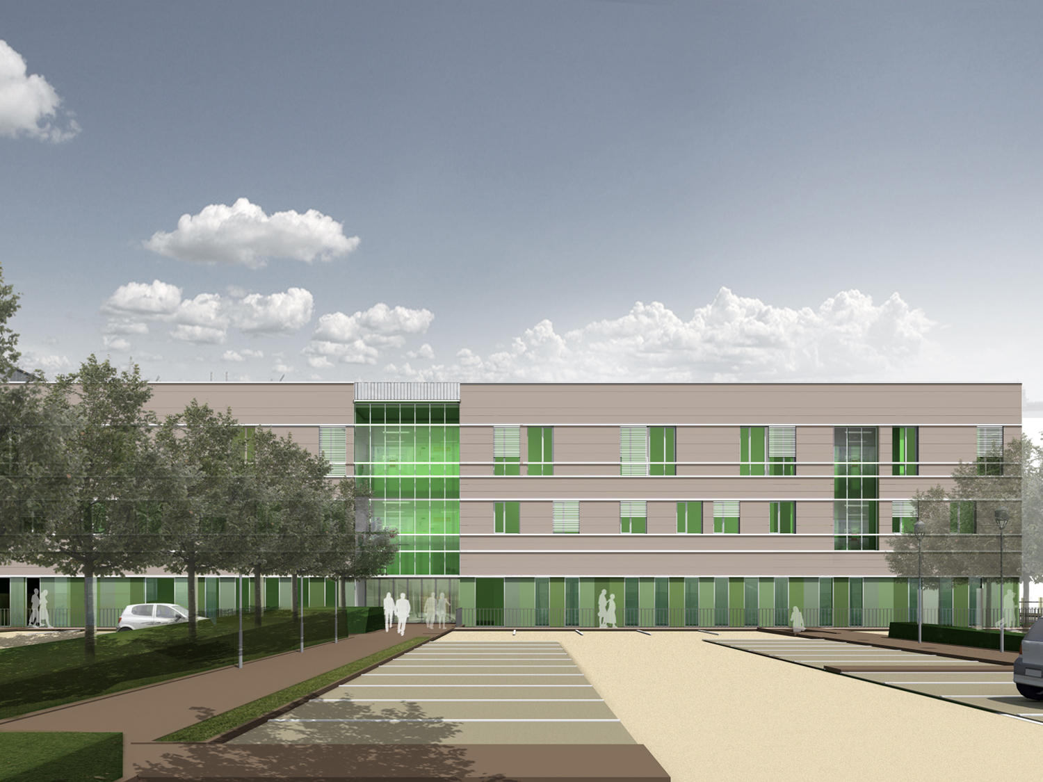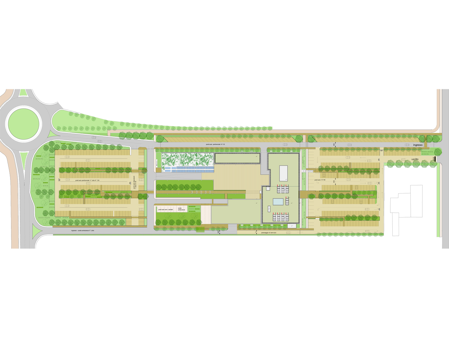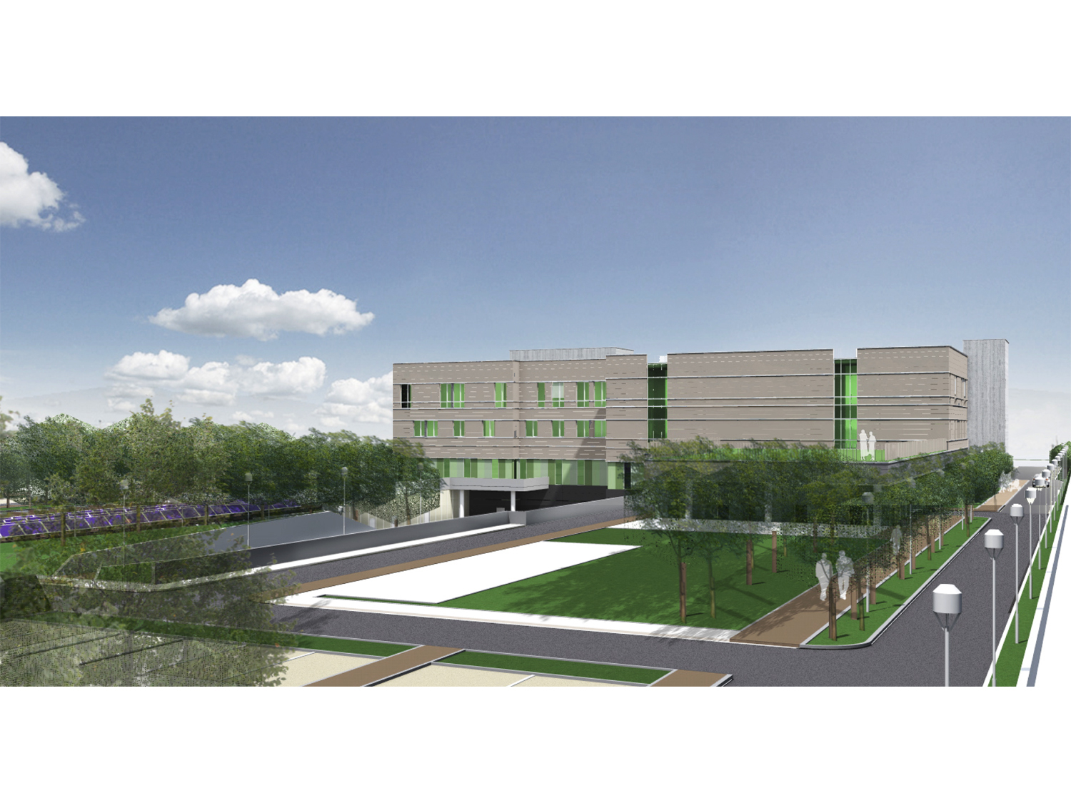 La volumetria complessiva è ricalca obbligatoriamente le scelte compositive di tipo generale attuate dal progetto preliminare a base di gara. Si è provato ad ammorbidire l’impatto del grande fronte sul lato ovest (circa 63 m di lunghezza) cercando di spezzarlo asimmetricamente in due parti, assecondando, con una grande vetrata, la presenza dell’atrio d’ingresso e delle aree di soggiorno-attesa presenti ai due piani superiori. Questo taglio coincide con l’asse principale della composizione planimetrica degli spazi al suolo, enfatizzando la posizione del punto di accesso non solo sul disegno dell’edificio ma anche, in verticale, come punto di riferimento degli assi visivi del perimetro.