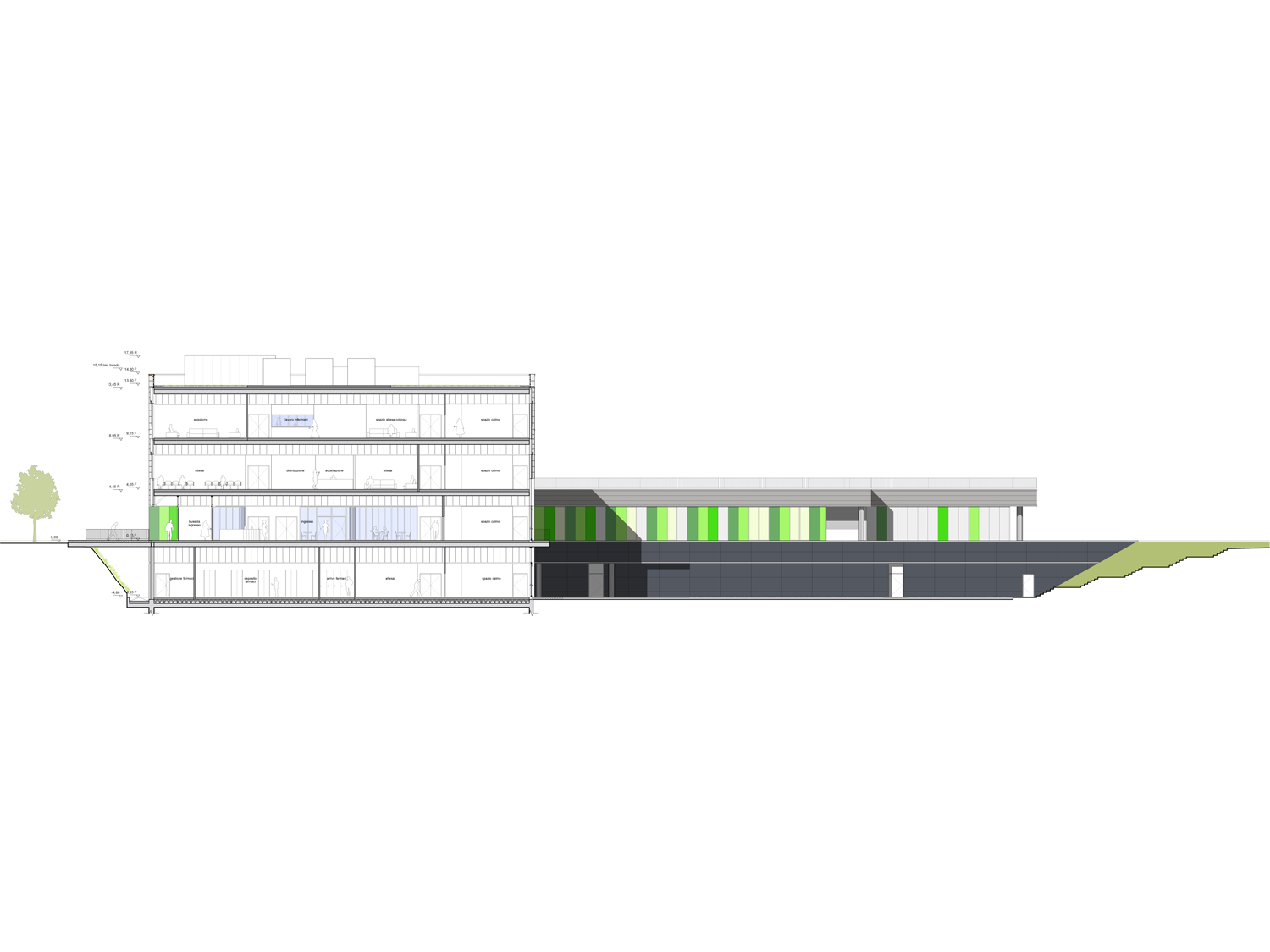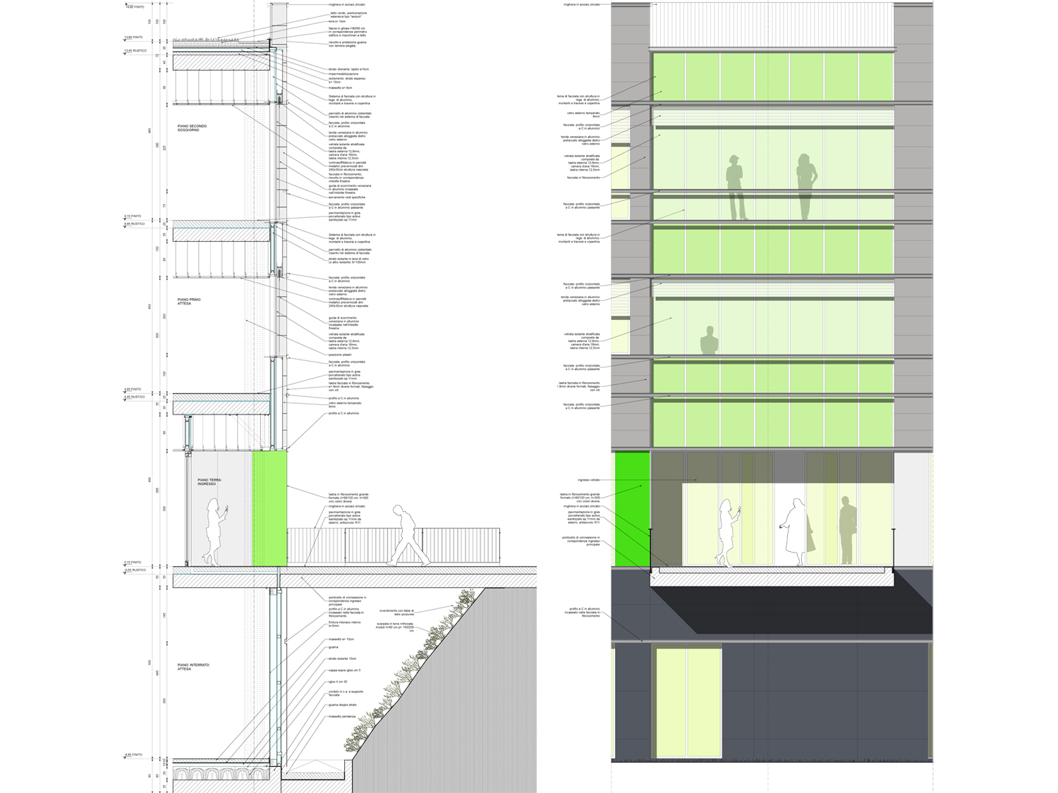Dal punto di vista edile le migliorie hanno riguardato prevalentemente la tecnologia di facciata per le quale si è scelto la parete tralicciata in legno, dalle ottime performance energetiche e dal ridotto impatto ambientale alla quale sono stati accoppiati pannelli in fibrocemento tipo swisspearl per il trattamento architettonico e cromatico delle facciate.