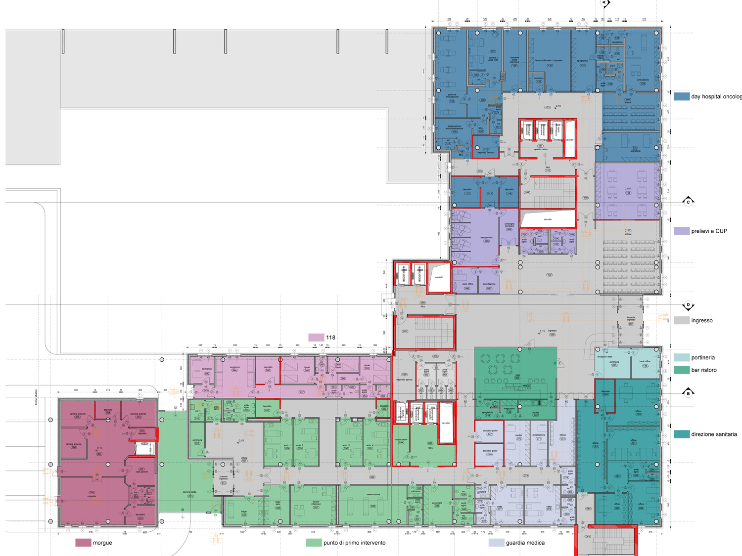 Dal punto di vista generale la riorganizzazione architettonica è partita dalla rivisitazione dello spazio per la degenza preso a modulo nella definizione dei passi strutturali e di tutti gli spazi che compongono la complessa organizzazione di un ospedale anche di piccola dimensione come quello oggetto della presente gara. A tale misura si rimodulano pertanto anche gli ambulatori e gli uffici e tutti gli ambienti operativi che al passo intero o ai suoi multipli riferiscono la loro dimensione.