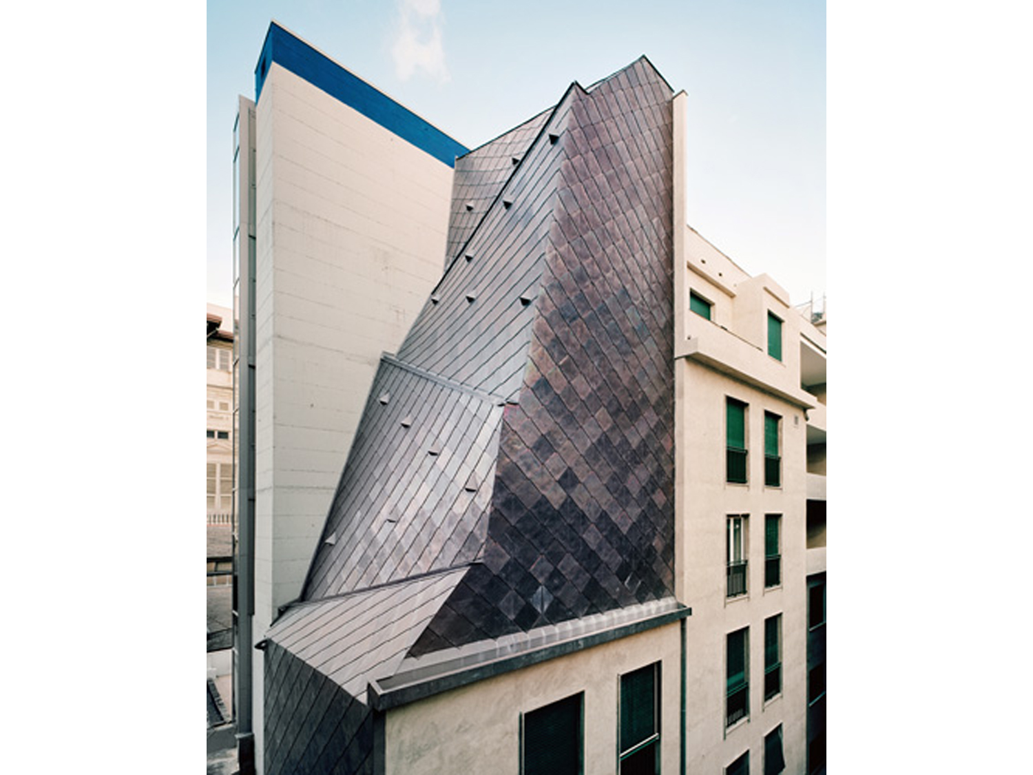 geometricamente moderna dell’involucro della nuova scala, immaginato in lastre di piombo sovrapposte, metallico ma non riflettente, scivolo ma non specchio per la luce