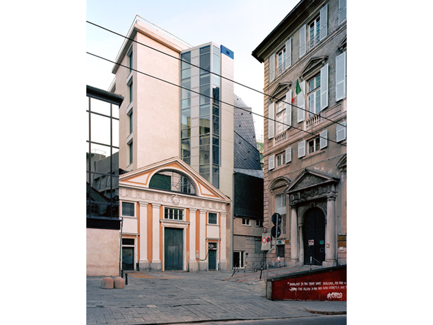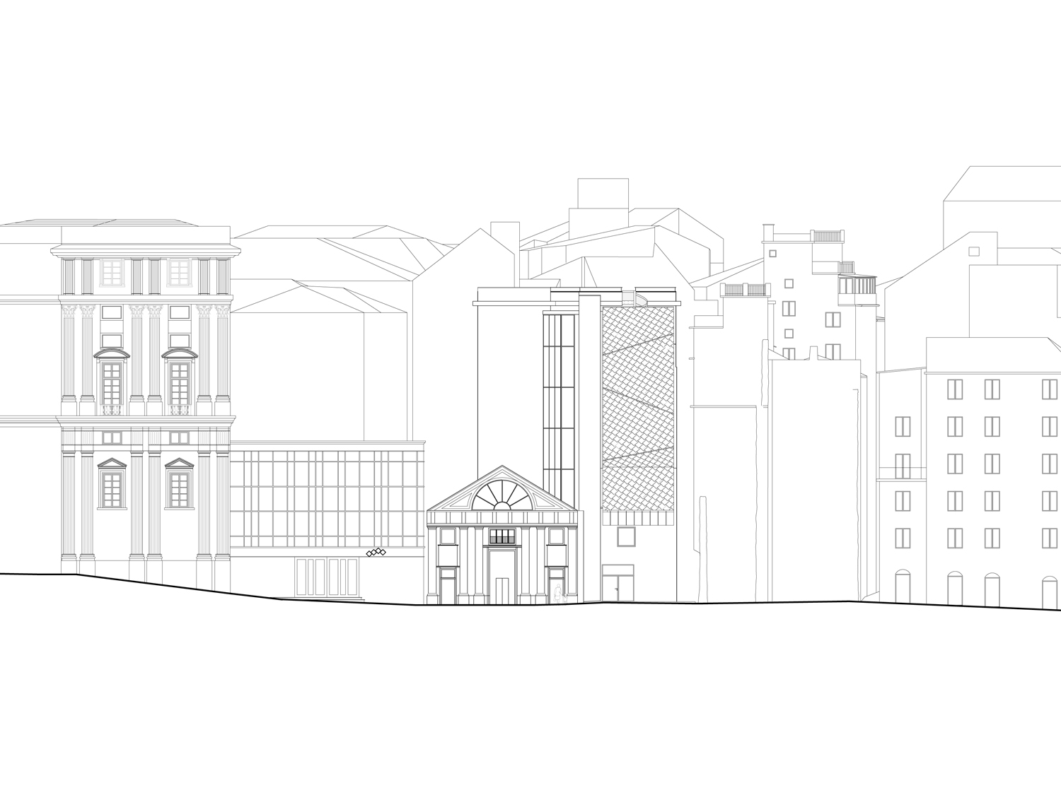 di emergenza, l’ascensore e la loro connessione con il sistema esistente arricchito dall’integrazione di tracce forti del passato come l’oratorio Orazione e Morte e il palazzo Belimbau. Infatti lo sperone verticale del nuovo ascensore