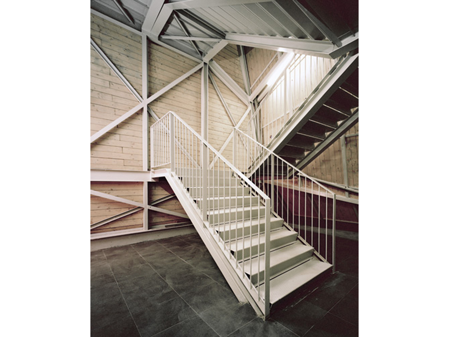 del piombo con la rudezza del cemento armato a vista, frastagliato dalle sbavature dei casseri realizzati con tavole sottili poste in verticale: una finitura senza l’ambizione di diventare astrattamente metallica. Il corpo dell’ascensore sorregge gli sbalzi delle propaggini terminali del corridoio centrale che si apre, verso la città e la luce, con una grande prua vetrata che si alza per cinque livelli.