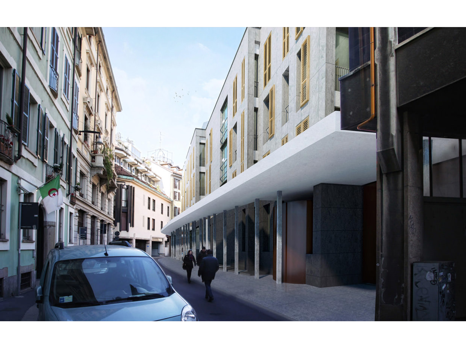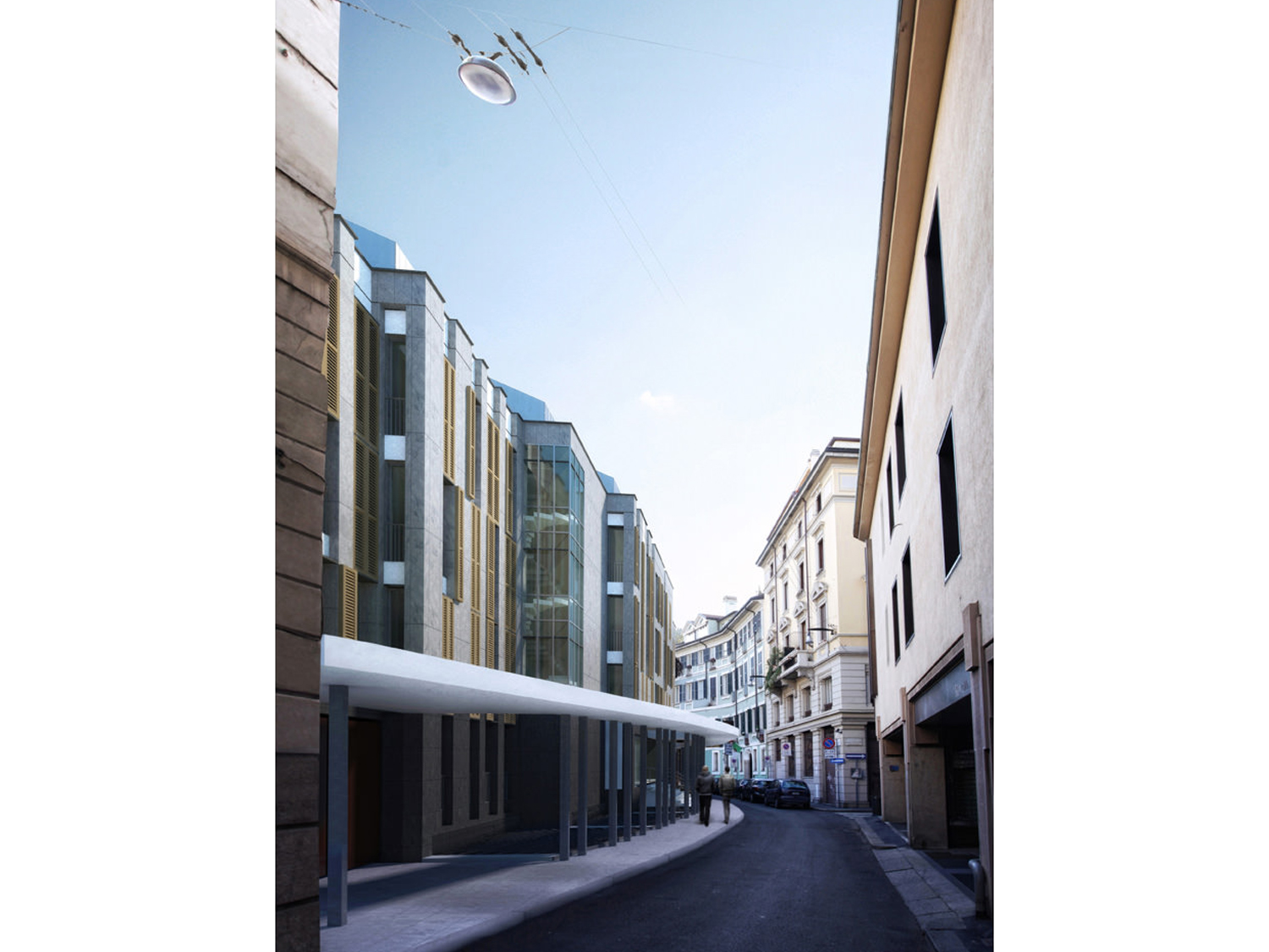 Nella composizione del prospetto principale su via Rovello si è deciso di lavorare su un disegno che ricollegasse il nuovo edificio alle geometrie dettate dai fabbricati circostanti, impiegando in modo diffuso il rivestimento in ceppo di Grè. La proporzione delle finestre riprende la giacitura verticale tipica dell’architettura milanese utilizzando in modo diffuso la porta finestra con apertura a tutta altezza e ringhierina esterna di protezione.