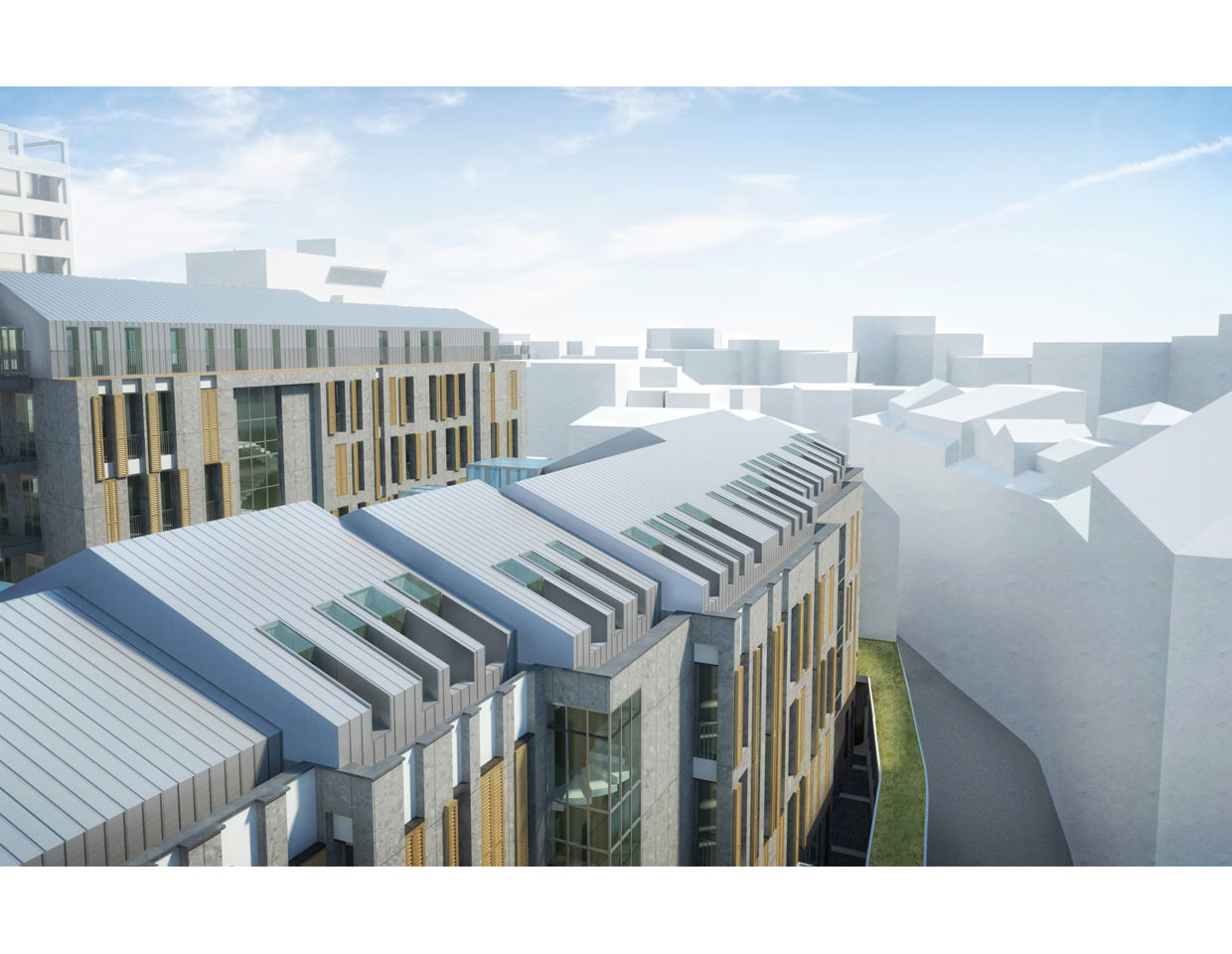 Sulla stessa geometria è disegnato anche il fronte della stecca interna orientato verso via Rovello. Il fronte est di entrambi i fabbricati è, invece, caratterizzato dalla presenza continua di superfici a terrazzo e ampie vetrate a illuminare gli ambienti interni.