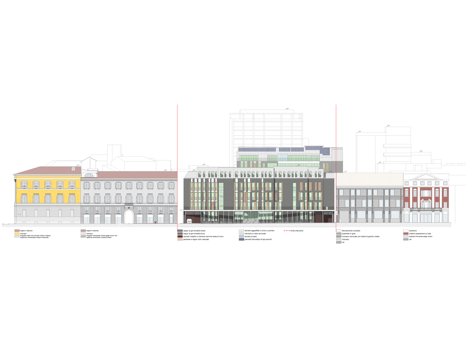 L’arretramento forzoso del nuovo fronte rende meno interessante seguire con il prospetto la curva esistente su via Rovello. La curva è stata quindi approssimata con una facciata ad andamento gradonato che parte dai due fronti ciechi e si espande verso l’apice della curvatura, proprio in corrispondenza dell’incrocio con via Pozzone. La curvatura della strada è ripresa dalla pensilina porticata giustapposta al fronte principale che si allinea con la quota d’intradosso al portico esistente a sud.