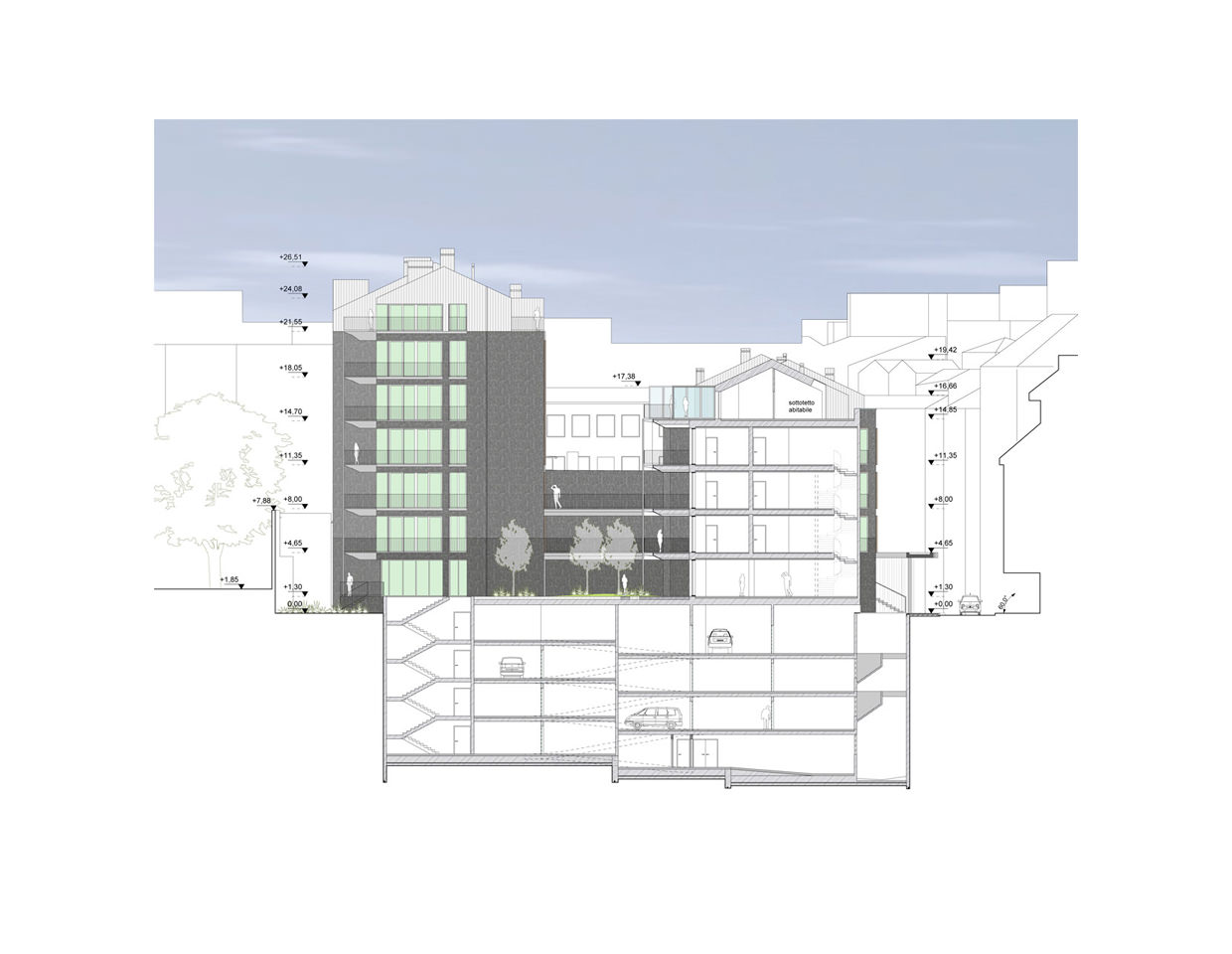 Un’autorimessa interrata soddisfa il fabbisogno connesso con la nuova costruzione rendendo inoltre disponibili posti auto per le esigenze della residenza circostante.