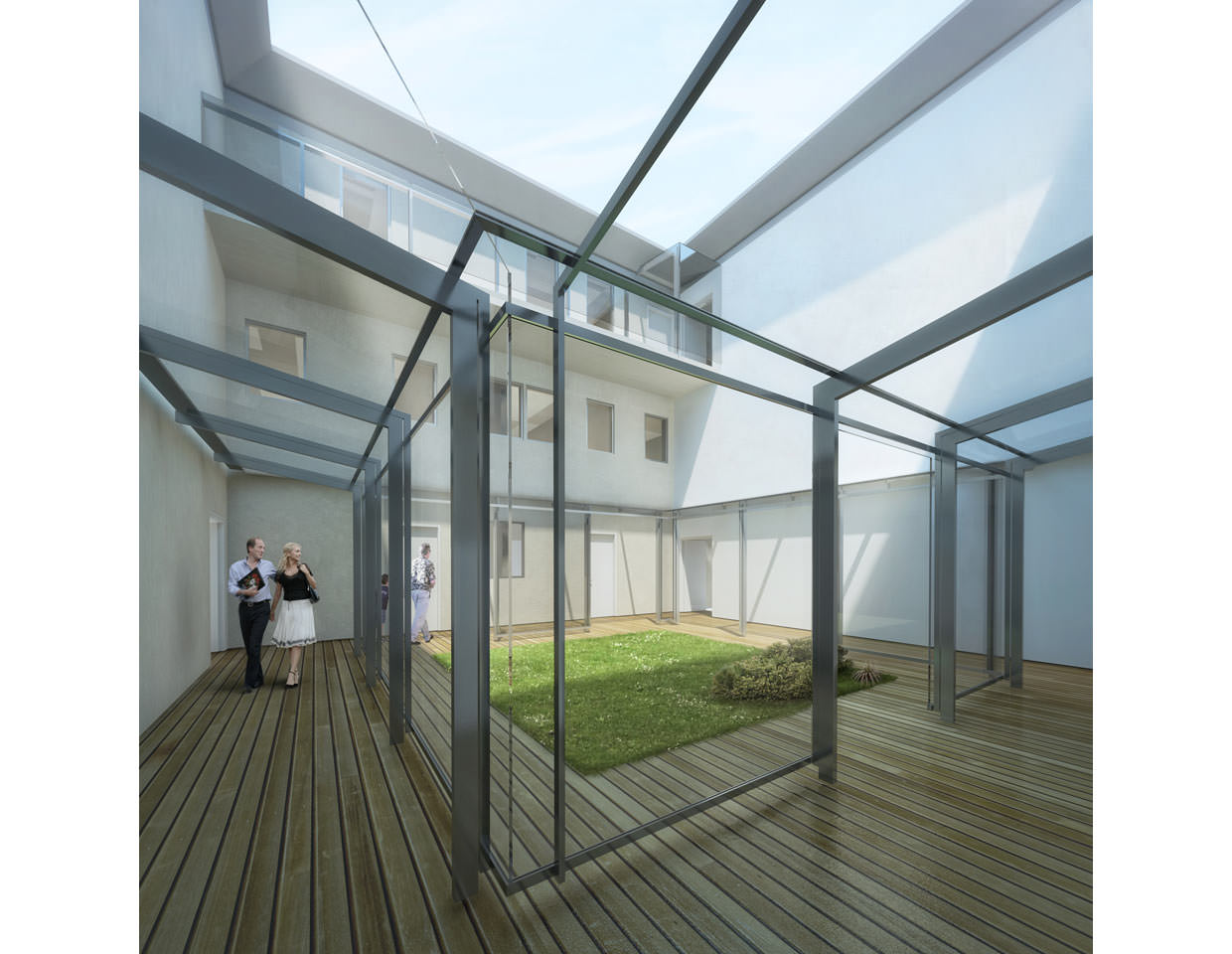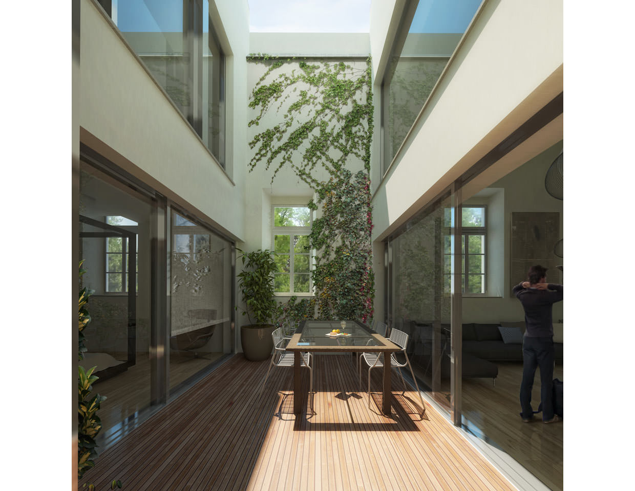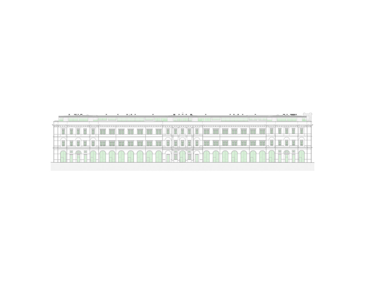 La proposta finale comunque è semplice: si tratta di ricostruire il solaio del secondo livello -staticamente ammalorato- circa 50 cm più in basso rispetto alla quota attuale per avere un interpiano con il piano attico di almeno 590 cm. L’ipotesi mette in gioco una modalità operativa che prevede di mantenere totalmente i prospetti, inserendo un nuovo manufatto che integra, in un unico sistema, gli elementi strutturali e di finitura orizzontali e verticali, a supporto delle stesse facciate e delle nuove unità residenziali dal piano secondo al piano attico.