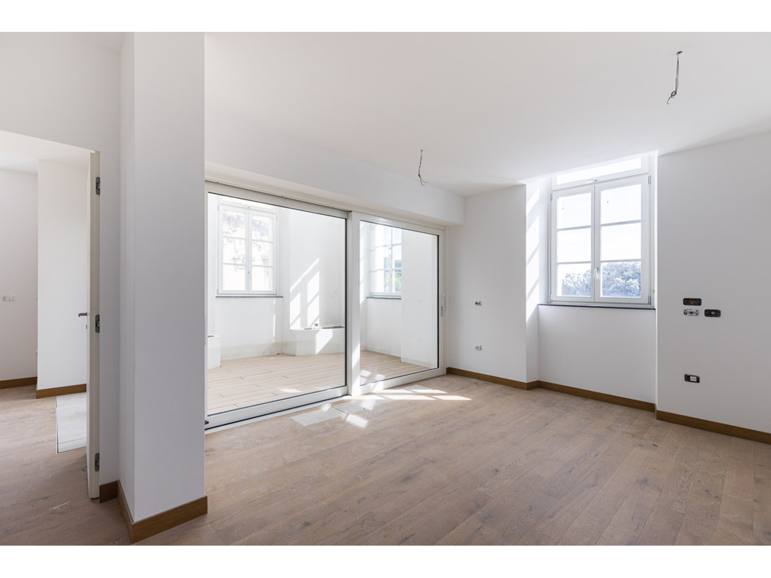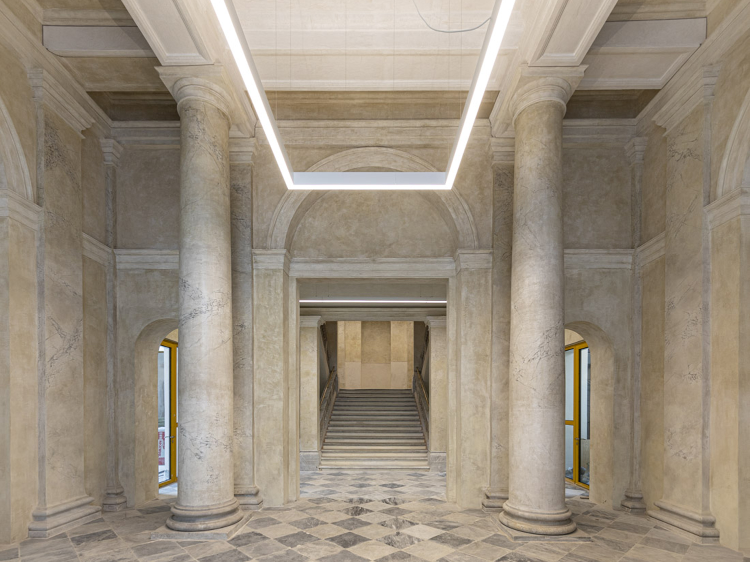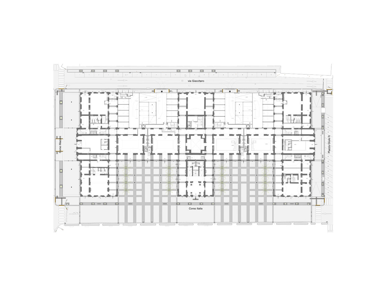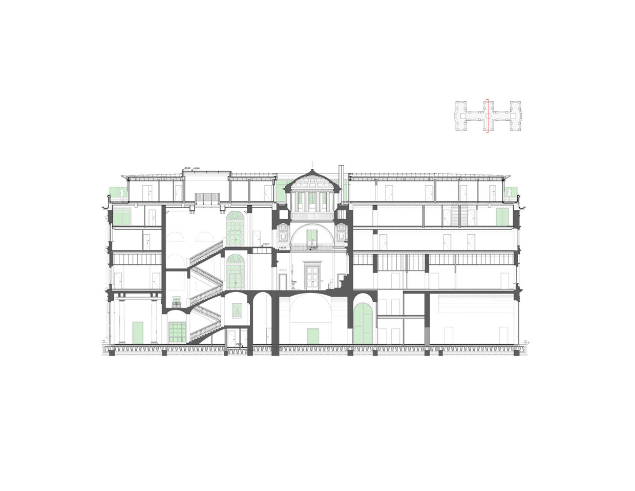 La soluzione per le residenze prende avvio da un interrogativo su quali siano le qualità di ambiente e spazio che devono essere valorizzate ed enfatizzate per rendere unico l’abitare all’interno di un edificio così ricco di storia. La risposta che sovente si ottiene in caso di recupero e trasformazione di manufatti antichi nati per altre funzioni, è quella di far dialogare e mettere in relazione organica le “sproporzioni” per creare ambienti che giochino sapientemente sulle dimensioni degli spazi: l’ampiezza degli ambienti di rappresentanza e l’esattezza dei vani per la quotidianità. Il nuovo progetto prova a rimettere in gioco le grandi luci d’interpiano per avere, al secondo livello, ambienti di soggiorno a tutta altezza alternati con una soppalcatura che arrivi a realizzare un vero e proprio piano intermedio, in parte affacciato su questo spazio interno di soggiorno e in parte affacciato su un loggiato posto a immediato ridosso della facciata.