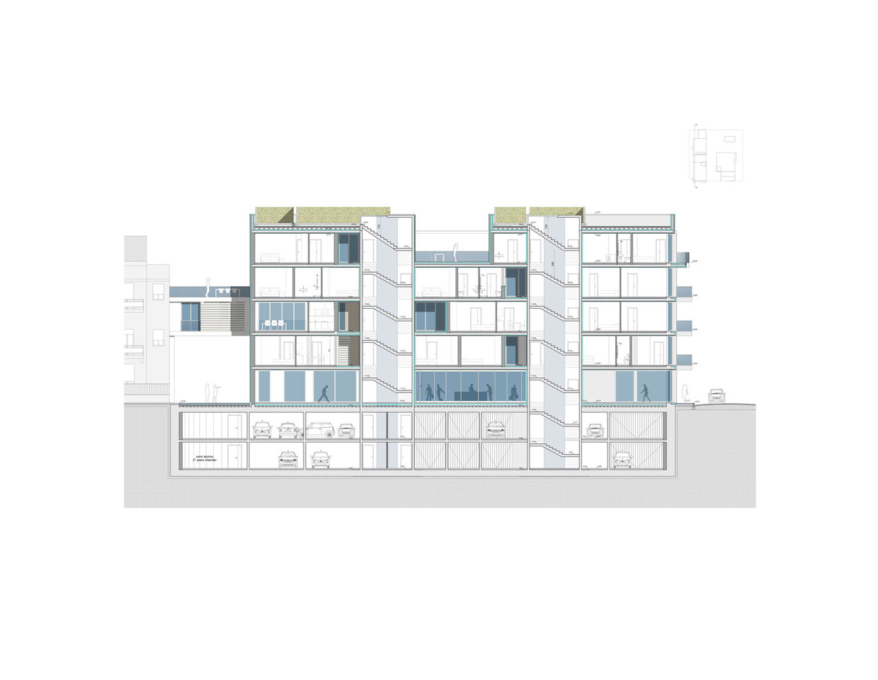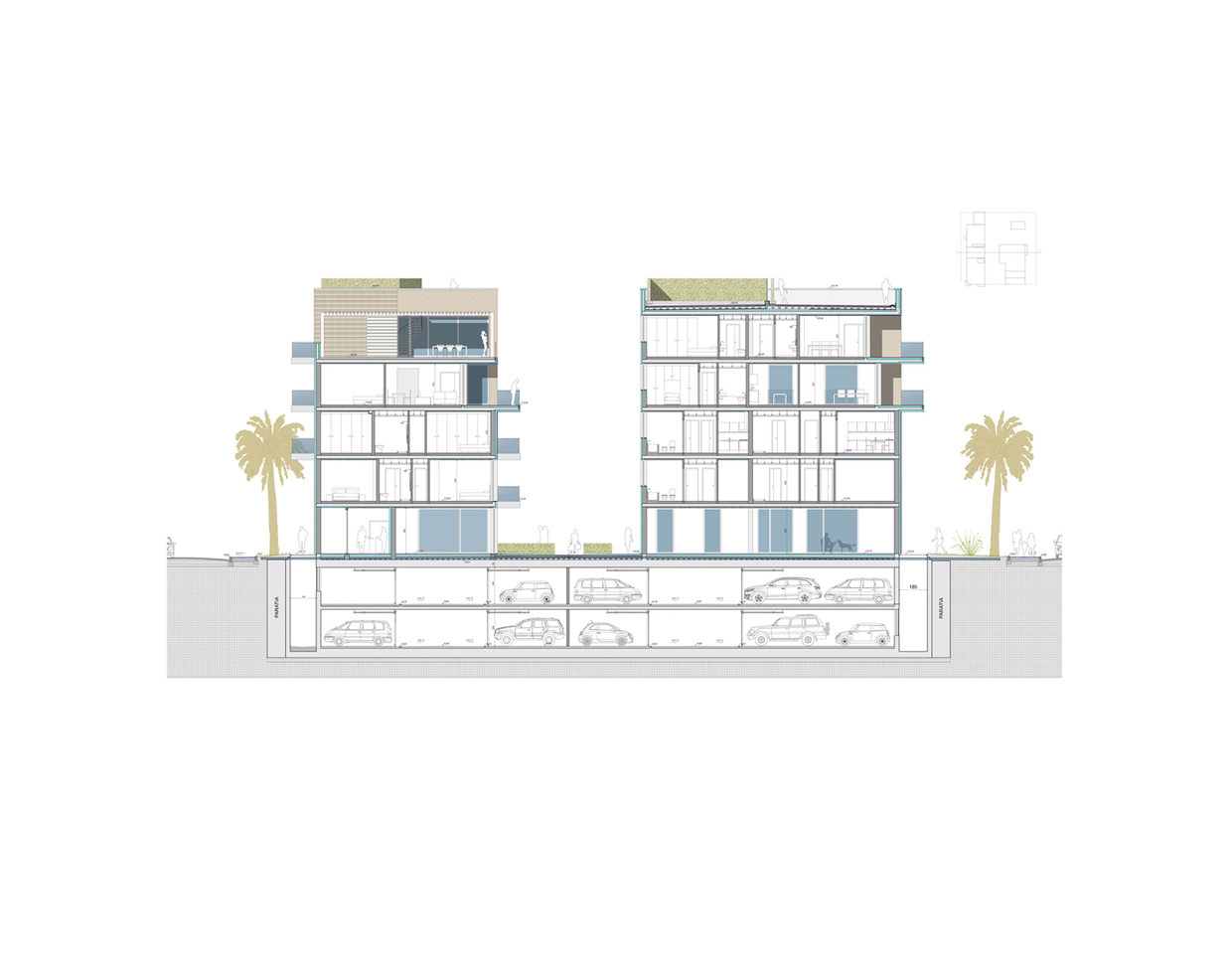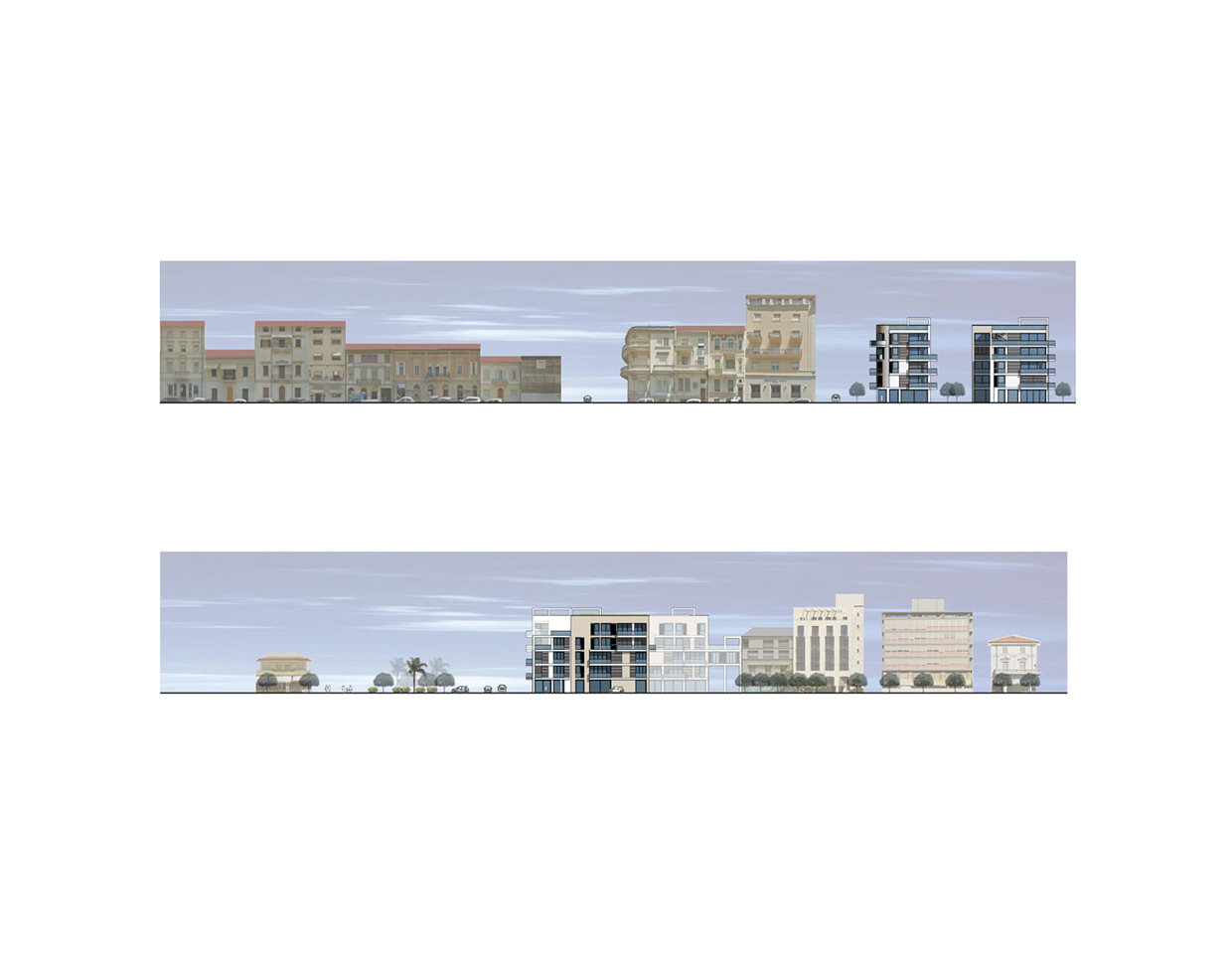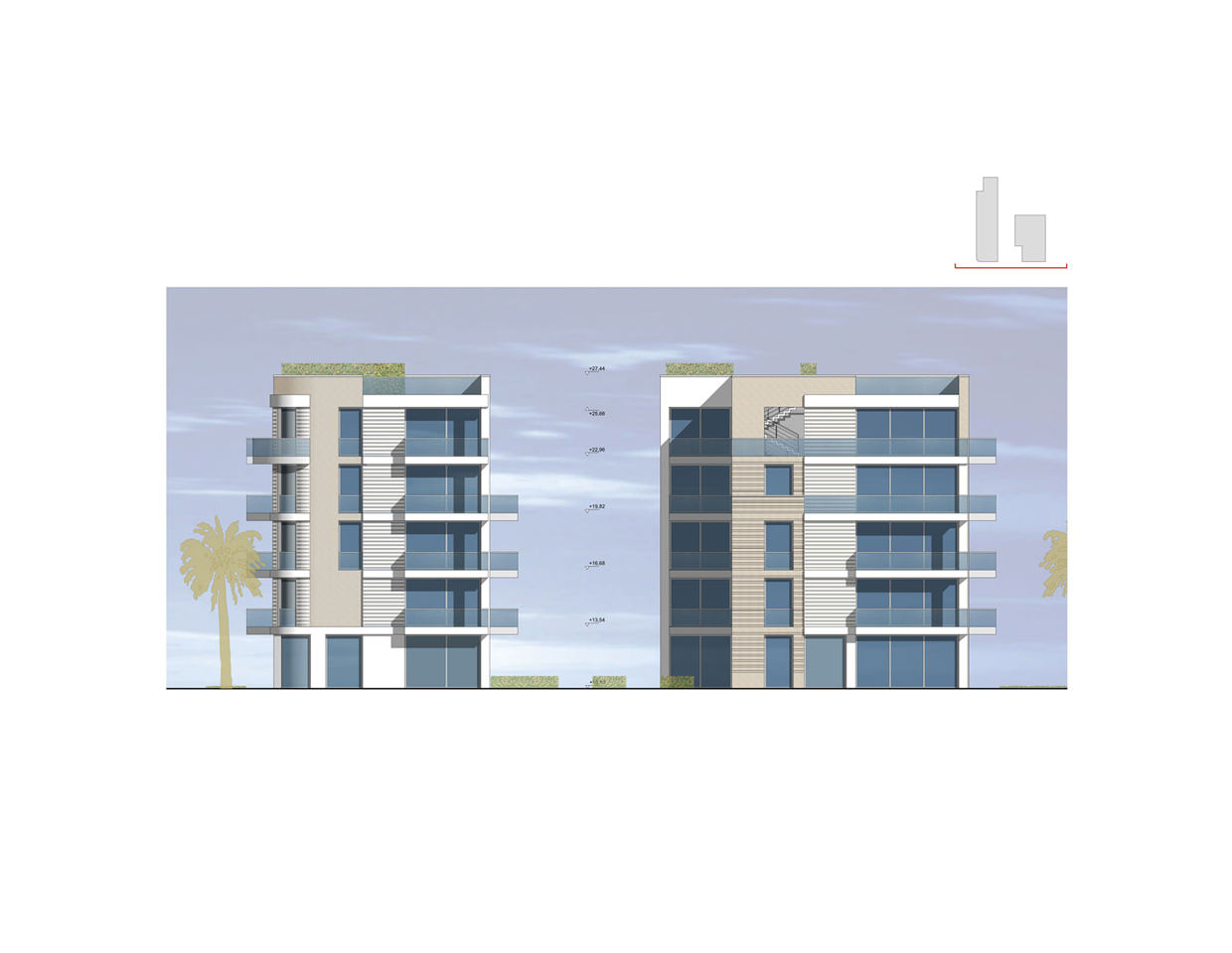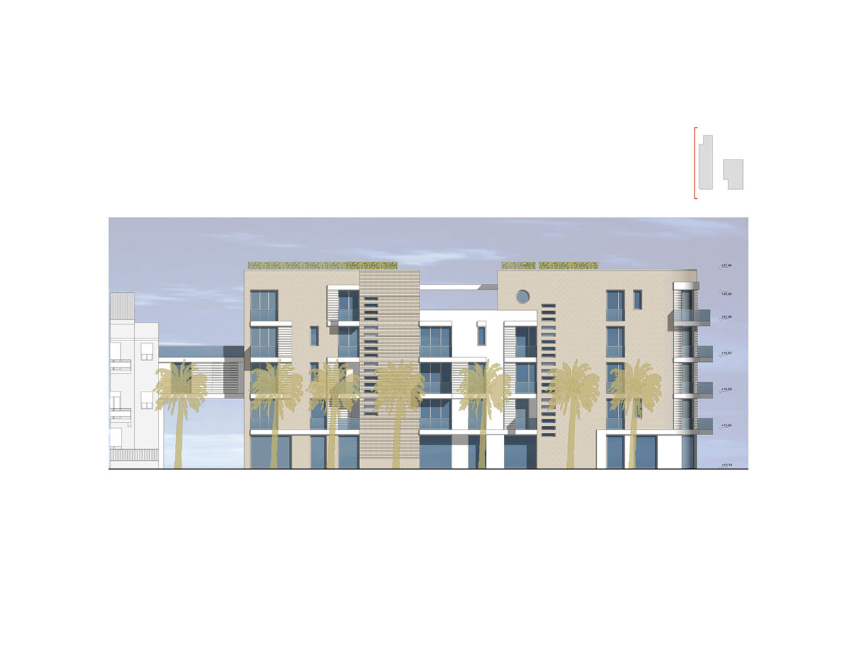 Il programma prevede la realizzazione di due edifici ortogonali al mare, uno prospiciente Piazza Mazzini ed il secondo lungo Via Carducci della quale costituisce tratto terminale e completamento della cortina urbana. La destinazione è prevalentemente residenziale, mentre il piano terra prevede la realizzazione di negozi ed uffici destinati all’utilizzo da parte dell’amministrazione comunale. Una ulteriore quota di uffici si trova anche ai piani superiori. L’autorimessa interrata su due livelli soddisfa il fabbisogno del nuovo intervento e delle funzioni pubbliche previste. Entrambi gli edifici sono di 5 piani, quello verso piazza è gradonato sul fronte verso mare; lo spazio tra i due è integrato con le percorrenze pedonali tra via Carducci, Piazza Mazzini e il mare.