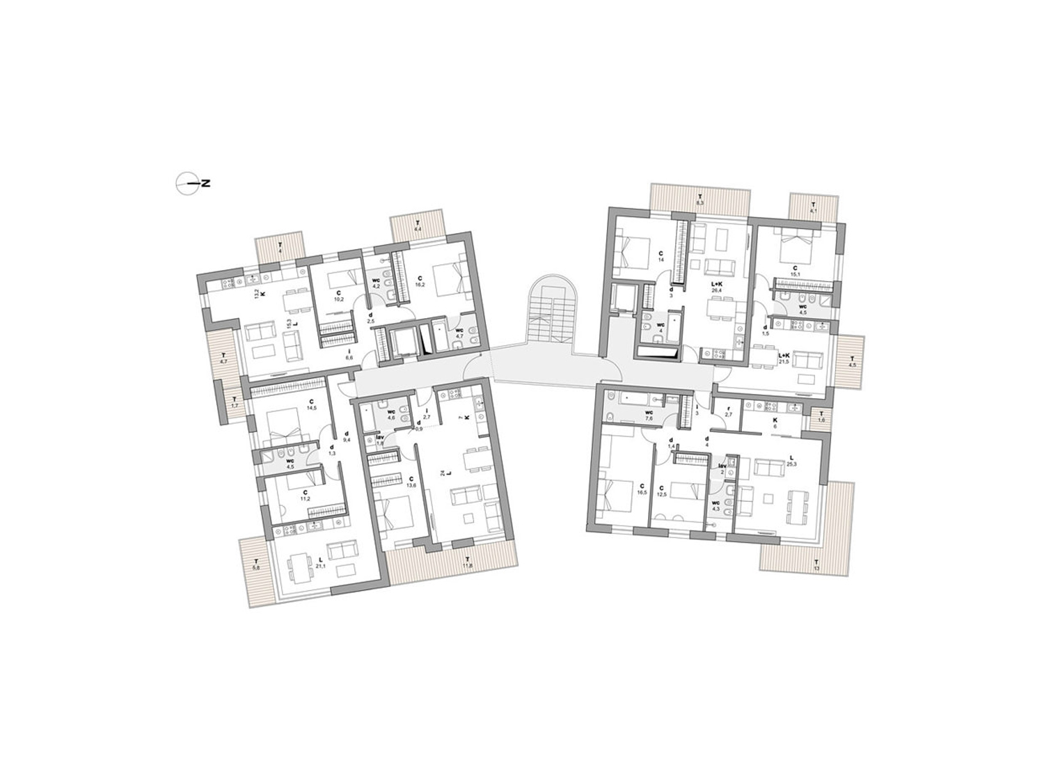 4) Costruzione di un nuovo parcheggio nelle aree antistanti l’edificio della ex-Colonia Monzese. I posti auto saranno in parte liberi a servizio della RP e degli edifici limitrofi, in parte pertinenziali per il nuovo intervento di edilizia residenziale pubblica e in parte completerà la dotazione minima di posti auto pertinenziali per il nuovo intervento residenziale, come previsto dalla normativa regionale vigente. Il nuovo parcheggio sarà integrato nel sistema dei percorsi e parzialmente coperto da un pergolato.
