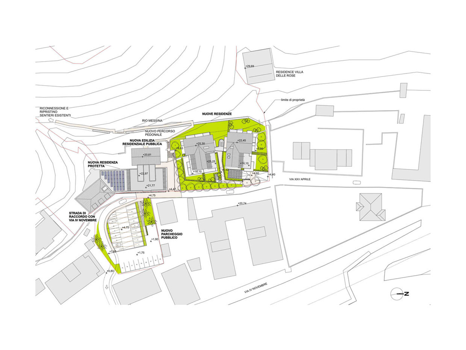 5) Realizzazione della nuova viabilità di connessione tra le vie XXV Aprile e IV Novembre allo scopo di migliorare la viabilità dell’area. 6) Definizione di un percorso pubblico che collega la strada vicinale Messina e i sentieri limitrofi con la via XXV Aprile, riconnettendo in un sistema organico le percorrenze pedonali dell’area.