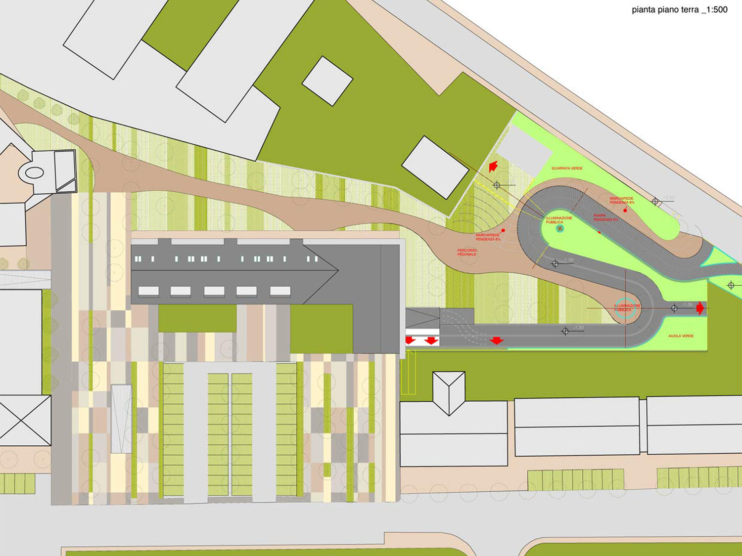 Particolare attenzione è stata posta alla individuazione dei percorsi pedonali e dei parcheggi di superficie per coinvolgere la biblioteca/centro sociale esistente tramite il disegno del suolo e definire altresì un comodo accesso al parco.