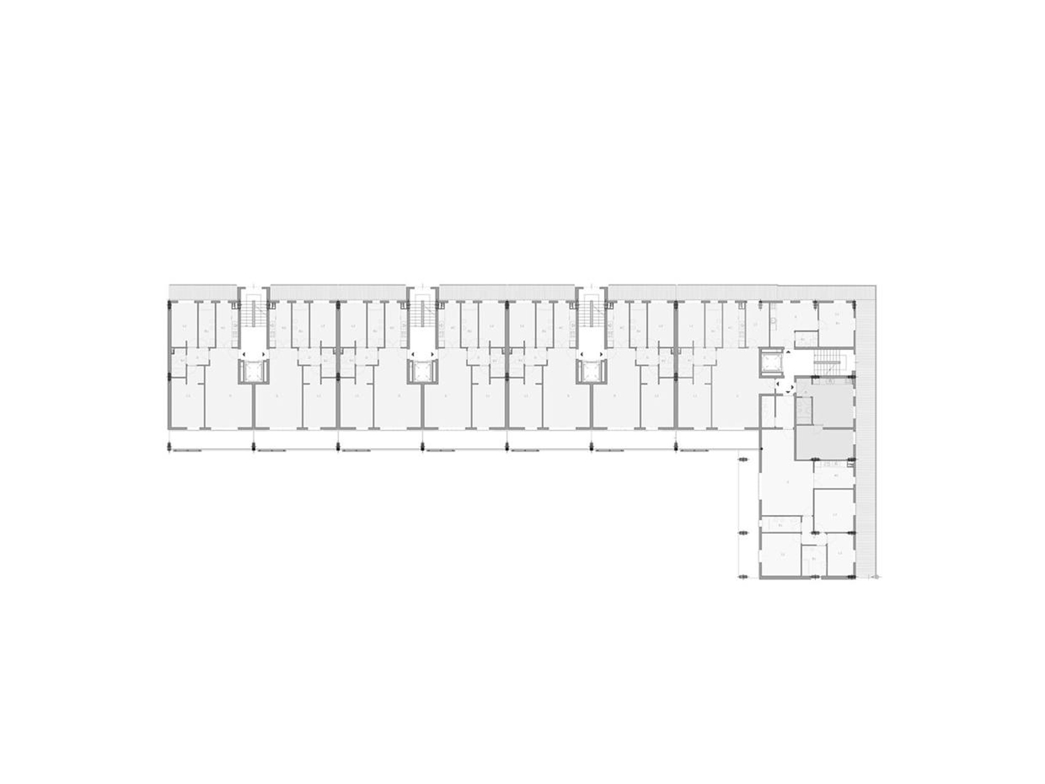 Le cellule abitative sono tutte dotate di terrazze lineare su entrambi i fronti, sia quello urbano che quello verso il parco. Questo consente di dotare praticamente ogni ambiente di porte finestre e creare ambienti molto luminosi. L’immagine che caratterizza l’edificio non è però quella del ballatoio, infatti il disegno della facciata prevede una controparete che non solo garantisce privacy e differenziazione alle diverse unità abitative ma “scava” con la luce la profondità dei prospetti. Questi sono più trasparenti verso il parco e più opachi verso la strada.
