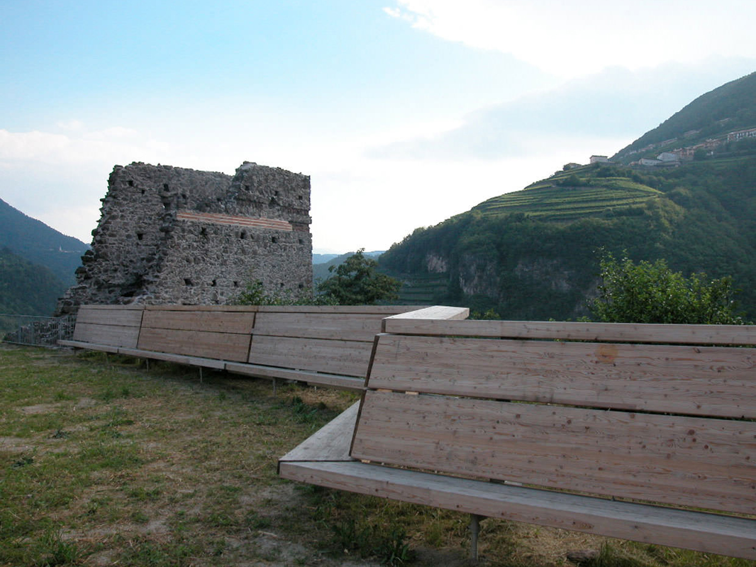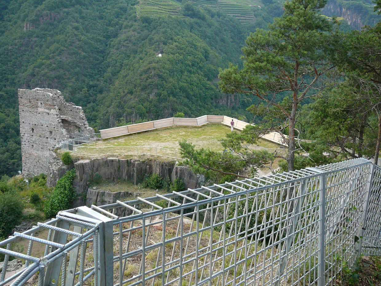 Infine arrivati allo spiazzo della torretta una lunga panca/parapetto poligonale in larice lamellare definisce una seconda area per manifestazioni e lascia godere la vista del precipizio sul torrente Avisio sottostante.