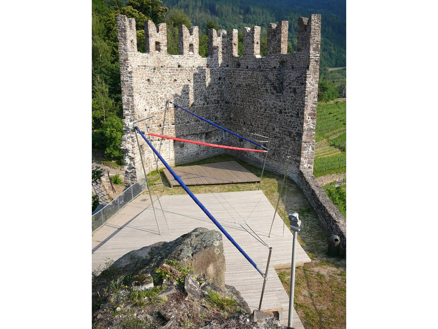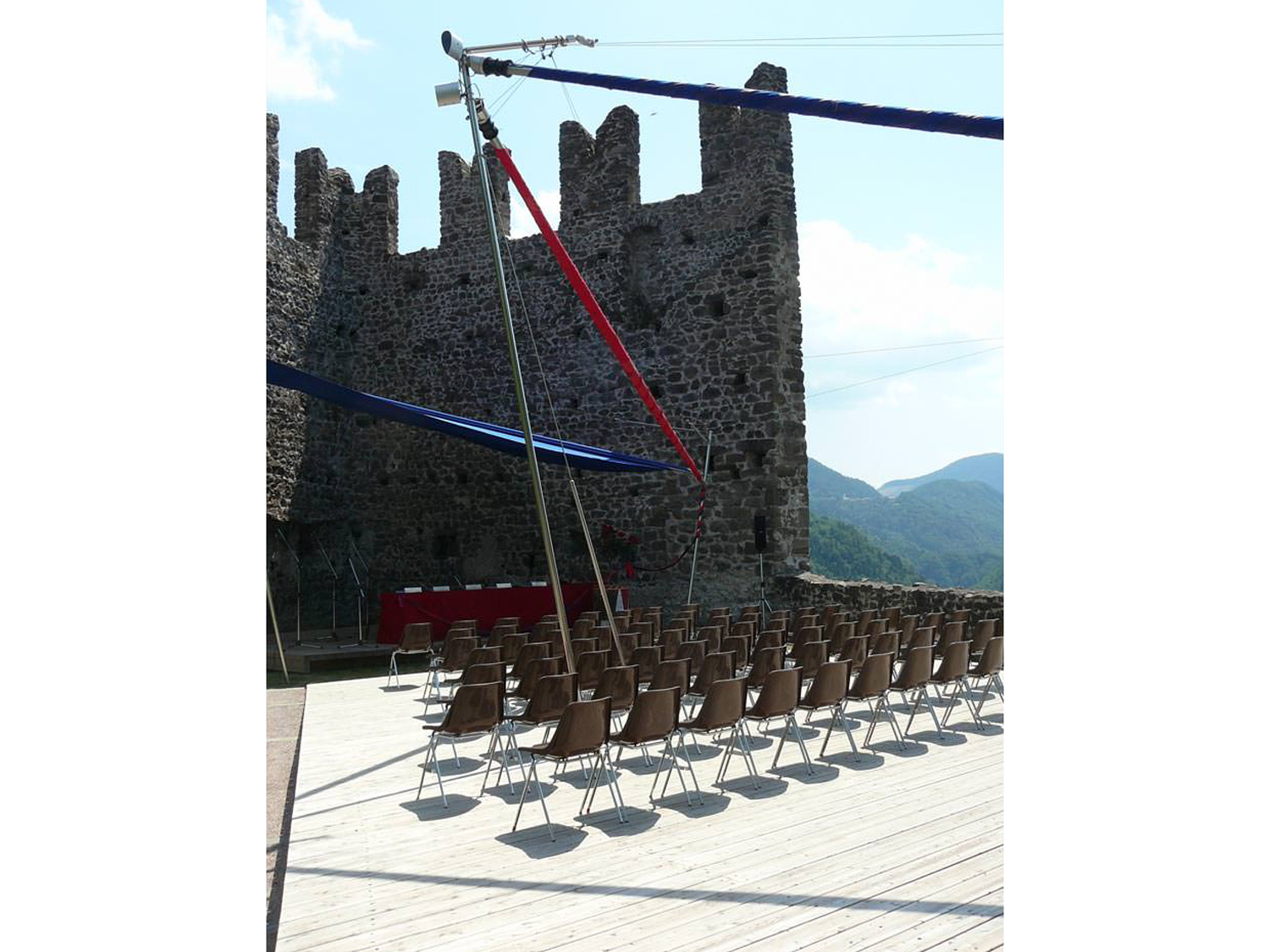 Viene realizzata un area spettacoli in corrispondenza dello sperone merlato: un tavolato in legno coperto da tende rosse e blu (i colori dello stemma comunale) che si chiudono avvolgendosi quando non utilizzate liberando completamente la vista sull’interno dello sperone.