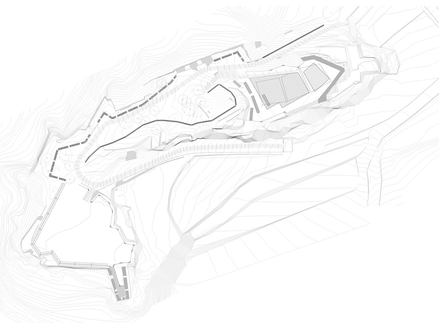 I percorsi sfruttano la grande disponibilità del porfido locale utilizzandone i sottoprodotti: come inerte nel cls architettonico per il percorso di visita; come riempimento dei gabbioni in acciaio nella definizione dei parapetti intervallati da luci, bordo materico di dimensioni “medioevali”, ma mimetico solo da lontano.
