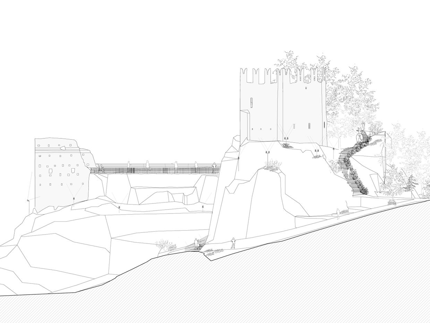 Il progetto accetta ed elabora questa strana natura del castello come percorso narrativo che inanella una serie di spazi aperti, ora dominati dallo sperone e dalla torretta, ora affacciati sulla valle o sul torrente Avisio, ora all’ombra degli alberi.