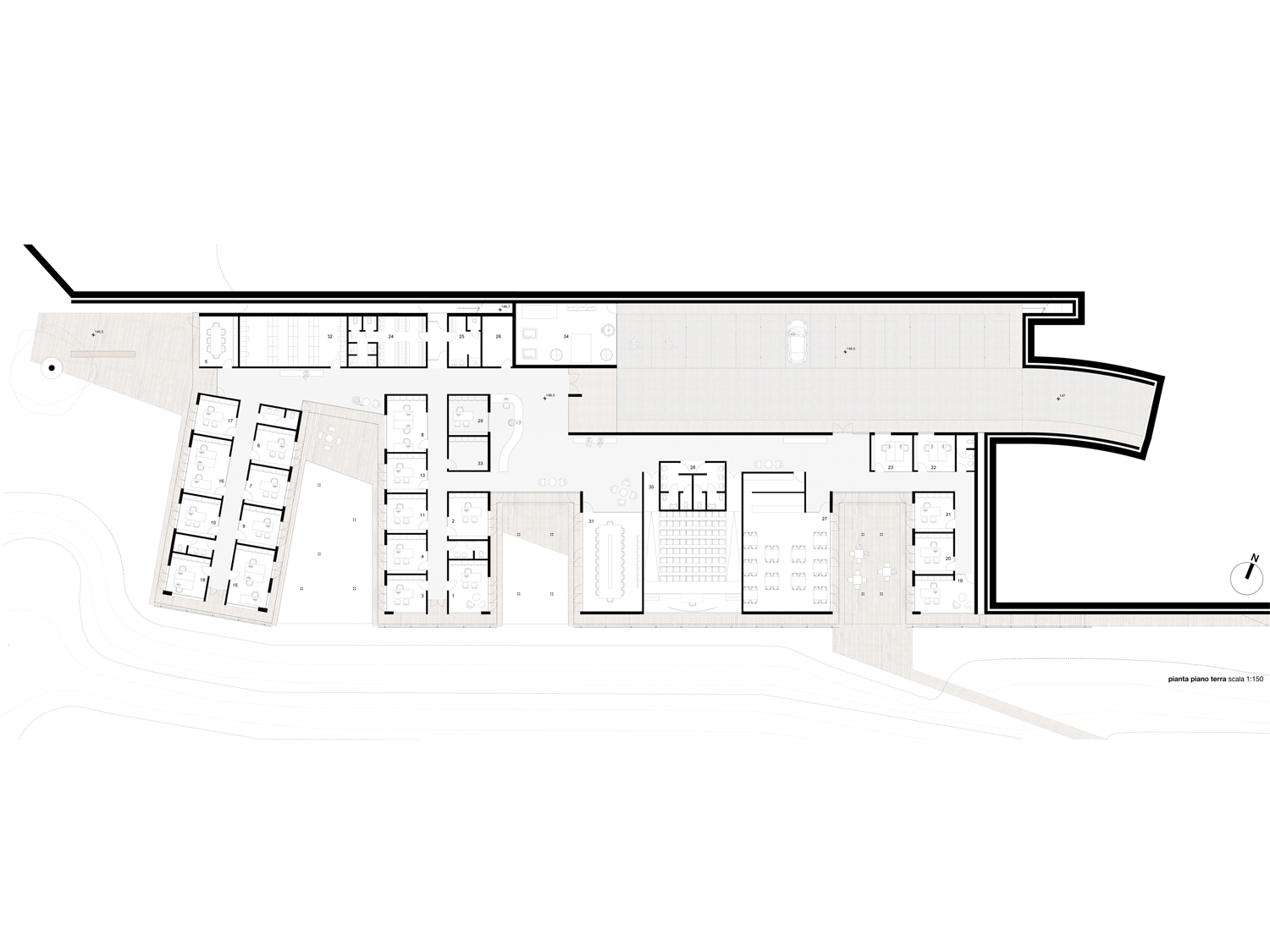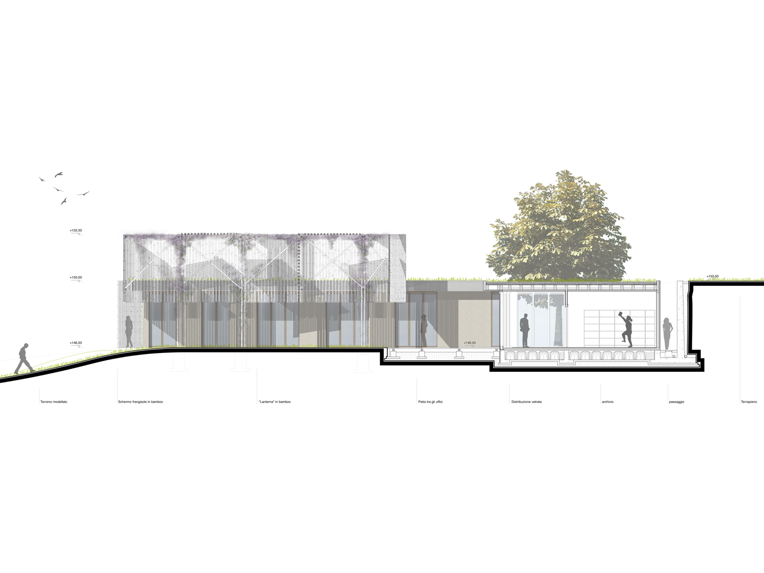 Scelta strategica preliminare è quella dell’edificio monopiano, che utilizza l’intera area a disposizione. Questo realizza una prima importantissima economia sulla struttura dell’edificio e consente di eliminare la circolazione verticale. Altrettanto importante è il posizionamento sul suolo, parzialmente ipogeo per avere continuità prospettica tra il tetto verde ed il terreno circostante. Il nuovo edificio è costituito da 4 blocchi funzionali (corrispondenti alle macro aree delle due aziende e degli spazi comuni) orientati nord-sud e quindi ortogonalmente al declivio. I blocchi sono raccordati da un percorso orientato est-ovest a monte del quale si trovano gli spazi di servizio. Tra i diversi blocchi si aprono i giardini interni coperti, cuore del progetto insieme alle “lanterne” che li sovrastano. Queste sono figure ibride a metà tra la serra ed il brise soleil; sono costruite in bamboo per la doppia valenza tecnologica e simbolica di questo materiale. Le strutture verticali ed orizzontali sono pareti portanti sandwich di legno.