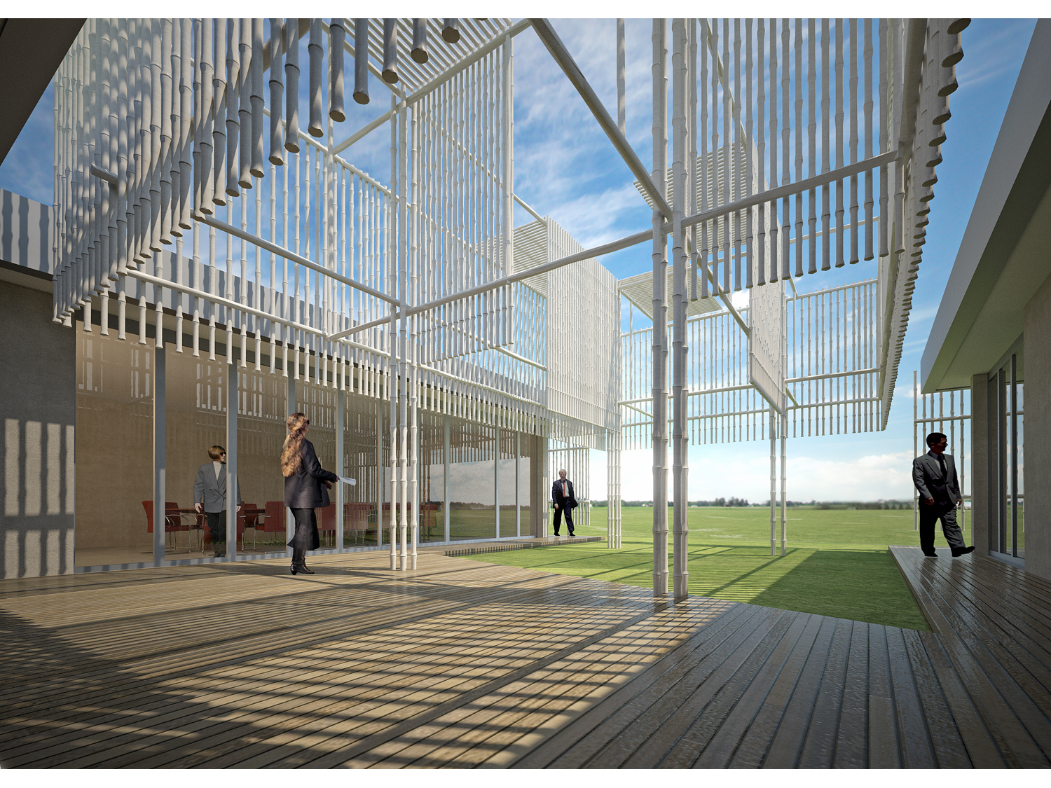 La facciata sud ha un disegno sincopato che ambisce a smaterializzare anticipandolo prospetticamente il volume del capannone esistente ed è realizzata con elementi in bamboo leggermente staccati dal suolo, in modo che l’edificio figurativamente appoggia su una linea d’ombra.