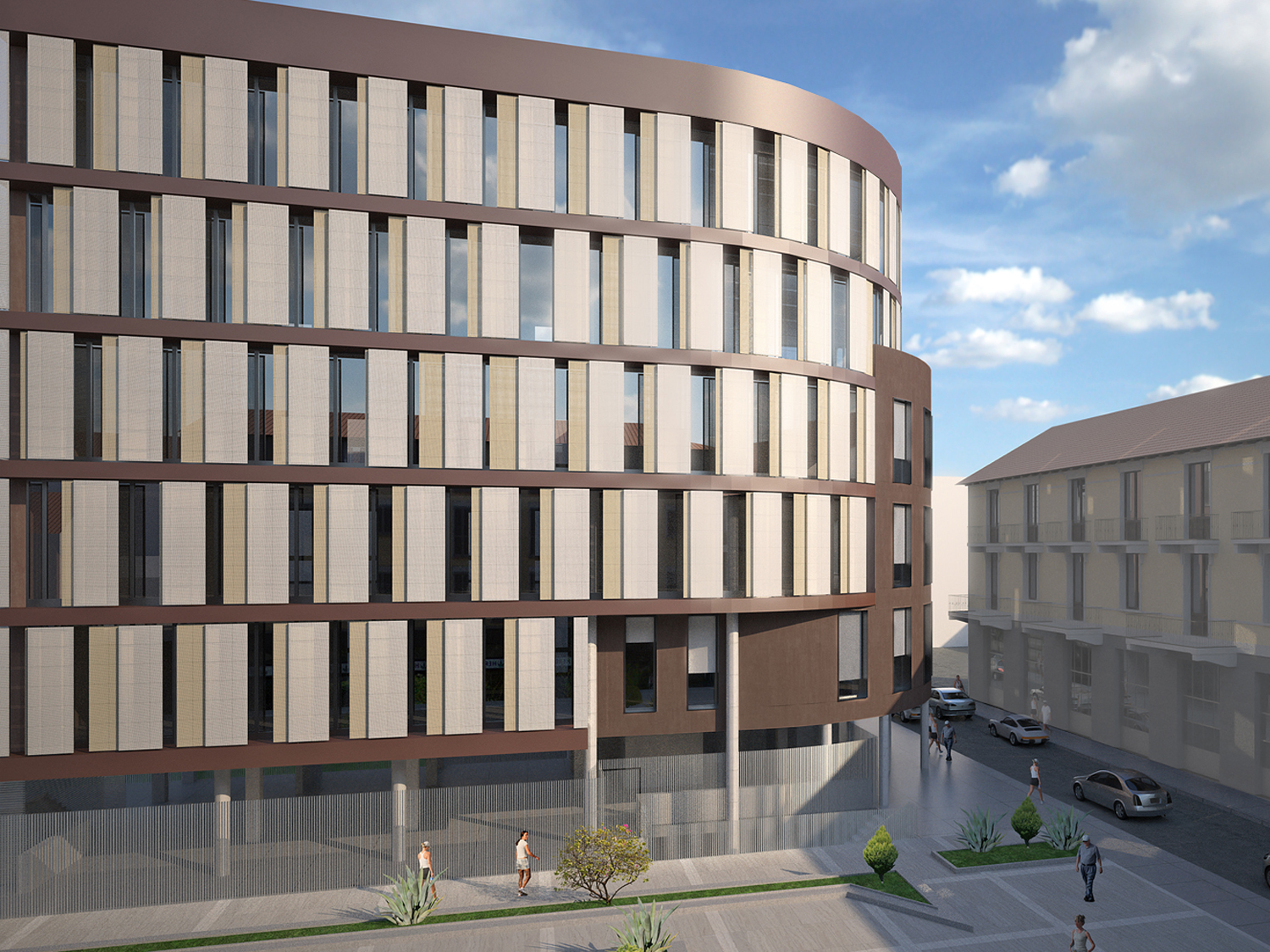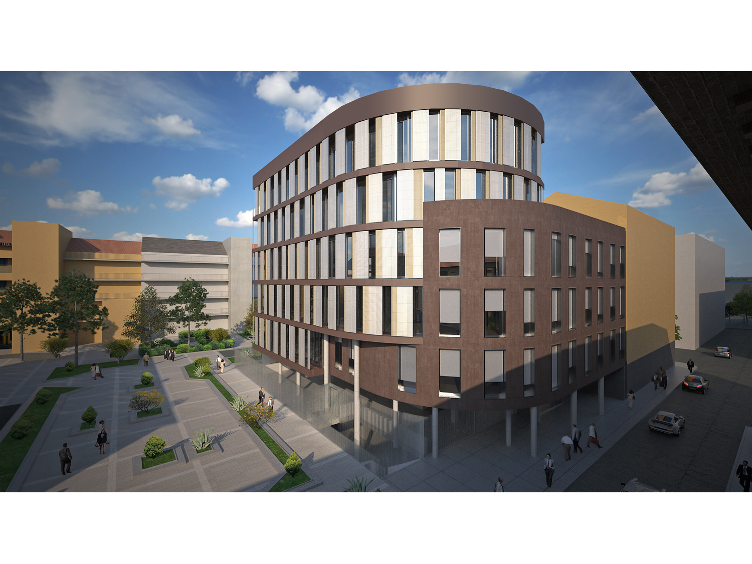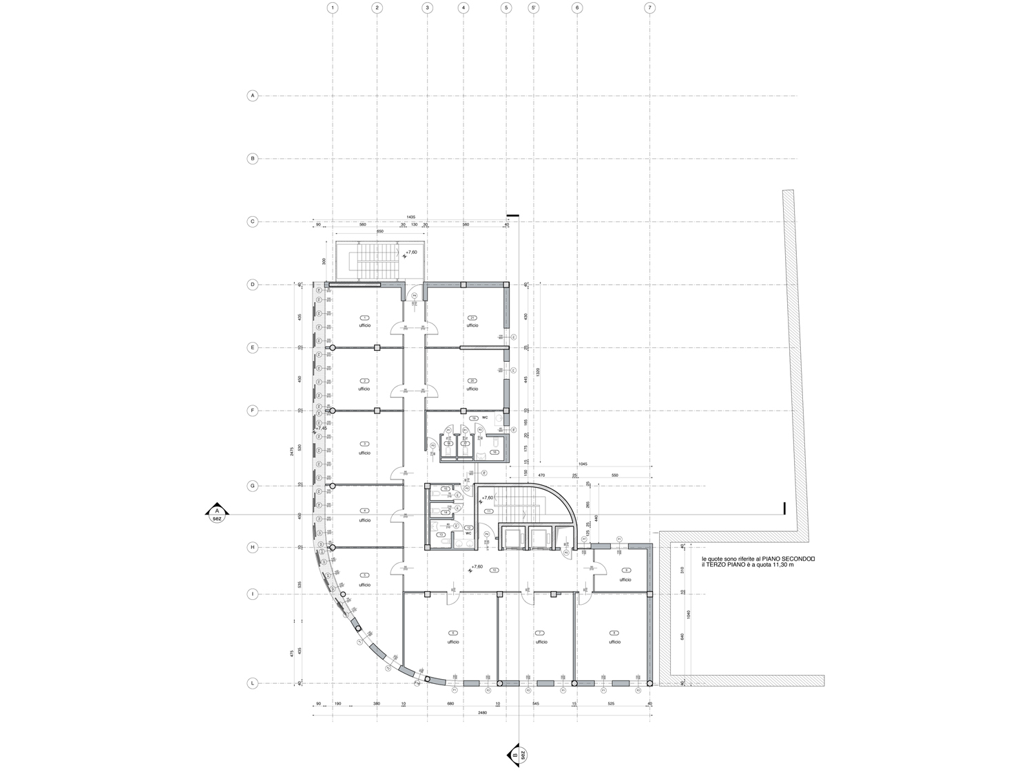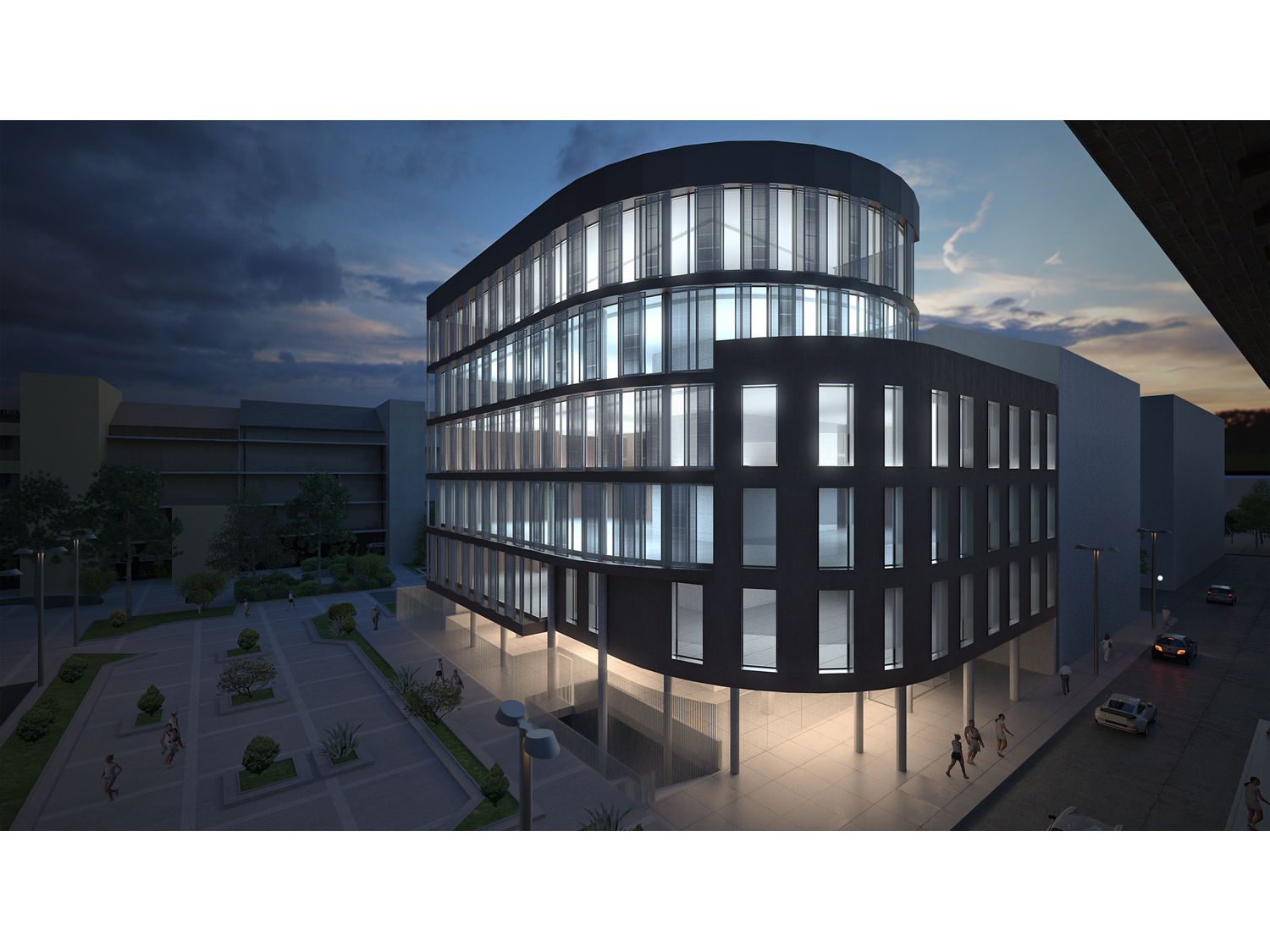 La curva nasce dal progetto preliminare, e attraverso le rampe interrate del parcheggio diventa sistema distributivo verticale e gioco di contrappunto per l’angolo dell’edificio dove la curva, che proviene dal basso, si incontra con la vecchia curva che aiutava l’edificio a flettersi verso l’interno del cortile. Il piano si piega e si trasforma da muro con finestre, ovviamente a passo verticale, a vetrata intercalata da forti ballatoi orizzontali, utili frangisole pronti a dialogare con il modo del cortile ma anche con i vicini uffici della Regione.