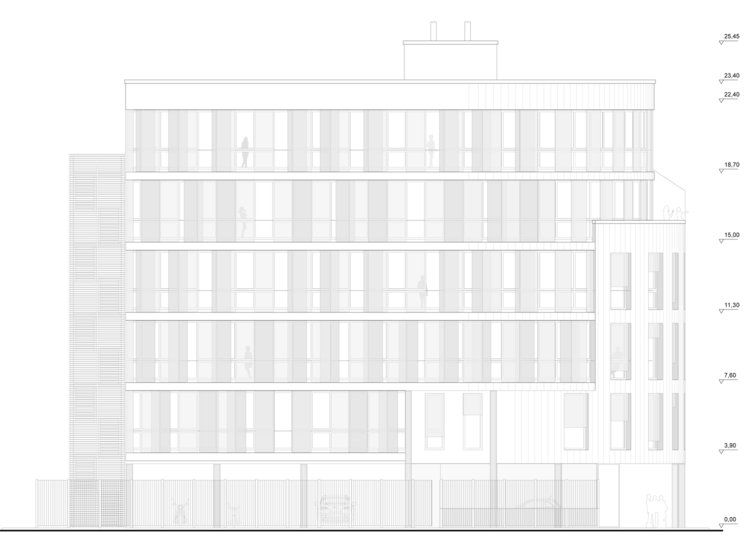 Come in quel buon esempio infatti non ci si è lasciati tentare dalla seduzione del semplice curtain wall ma ancora una volta la verticalità dei serramenti è interrotta in modo chiaro dalle forti linee orizzontali dei marcapiano. Il prospetto su strada, murario, intonacato con poche finestre diventa progressivamente vetrato. Ancora una volta l’intercalare alternato delle tende è pronto a trasformarsi in superficie continua: l’estate con tutte le tende chiuse restituirà una vista molto astratta del fronte interno pronto a rivelarsi in un gioco di trasparenze a seconda dell’incidenza dei raggi solari.