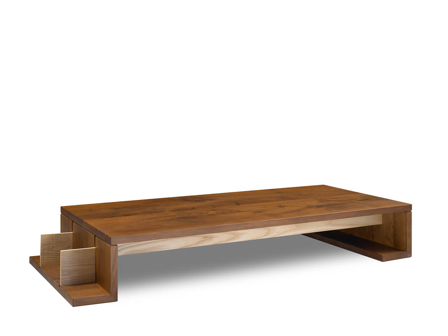 Cimbalo Basso è un tavolo da salotto. Il piano ed i fianchi/sostegni sono in noce, la struttura è in frassino chiaro. In frassino sono anche gli elementi mobili da impiegare secondo le necessità. Reggilibri, sottobottiglia o sottobicchieri, vano portariviste. I fianchi/sostegni si possono montare con l’ala rivolta all’interno o all’esterno, a piacere.