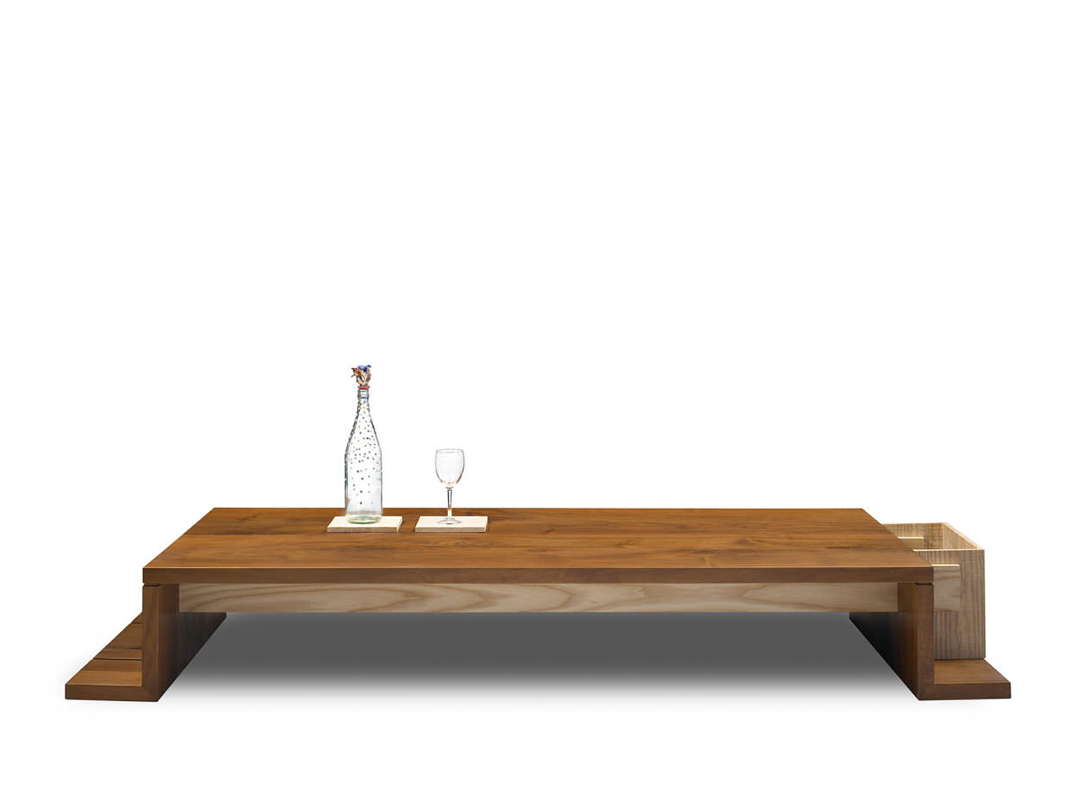 La panca nasce dalla deformazione di quattro parallelepipedi. I singoli elementi, sgabelli, possono essere usati anche come contenitori, tavolini o comodini. È sufficiente comporli o scomporli a piacere. Per sottolinearne la versatilità questo oggetto è stato pensato in quattro essenze diverse: noce, castagno, larice e faggio.