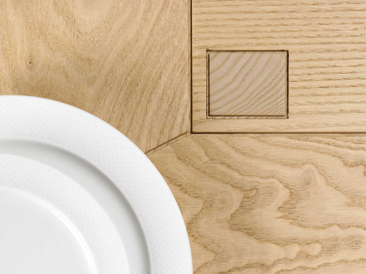 Un tavolo quadrato cui possono sedere comodamente otto commensali. Le gambe e la struttura sono realizzate in legno di rovere vecchio di recupero. Il piano è di corian, disponibile in un’ampia gamma di colori. Il tavolo 124 si caratterizza per l’inusuale accostamento tra la superficie scabrosa del legno e la levigatezza del corian.