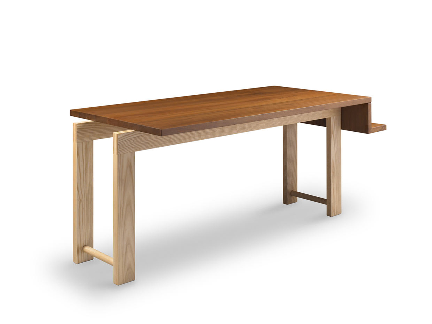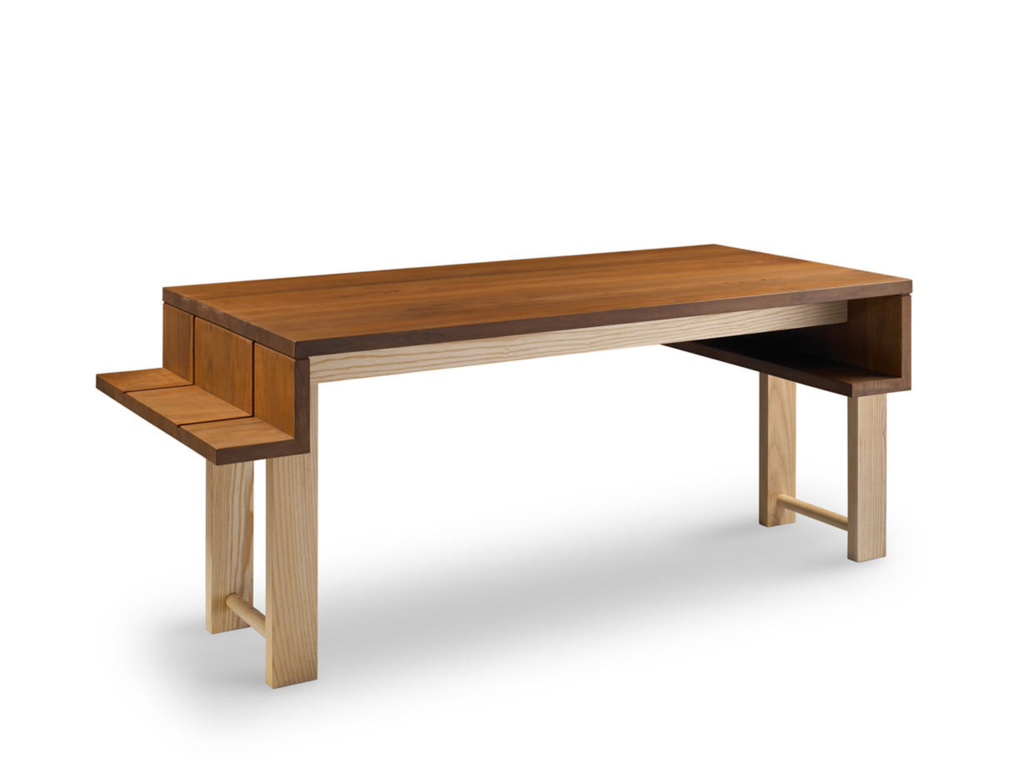 la scrivania Cimbalo Alto è costituita da una struttura chiara in frassino e da un piano più scuro in noce. Il piano di dimensioni 160 x 80 cm può essere completato con uno o due elementi a “L”. Gli elementi hanno la funzione di mensole reggilibri o di piano d’appoggio. Il nome Cimbalo perché il piano con un elemento a “L” ricorda lo strumento musicale.